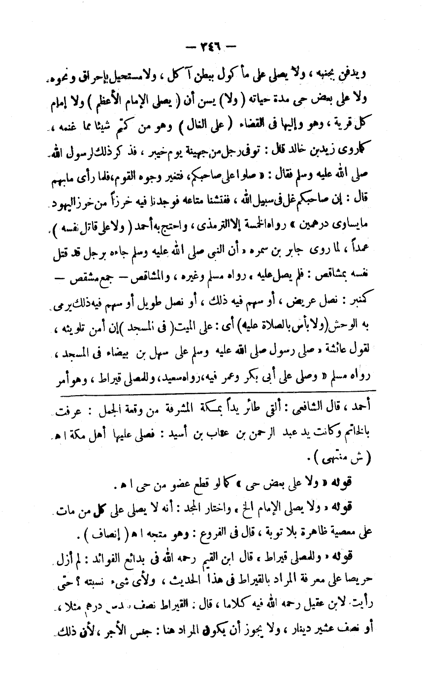 ويدفن بجنبه ولايصلى على مأكول ببطن آكل ولا مستحيل بإحراق ونحوه ولا على بعض حي مدة حياته ( ولا ) يسن أن ( يصلي الإمام ) الأعظم ولا إمام كل قرية وهو واليها في القضاء ( على الغال ) وهو من كتم شيئا مما غنمه لما روى زيد بن خالد قال توفي رجل من جهينة يوم خيبر فذكر لرسول الله صلى الله عليه وسلم فقال صلوا على صاحبكم فتغيرت وجوه القوم فلما رأى مابهم قال إن صاحبكم غل في سبيل الله ففتشنا متاعه فوجدنا فيه خرزا من خرز اليهود ما يساوي درهمين رواه الخمسه إلا الترمذي واحتج به أحمد ( ولا على قاتل نفسه ) عمدا لما روى جابر بن سمرة أن النبي صلى الله عليه وسلم جاءوه برجل قد قتل نفسه بمشاقص فلم يصل عليه رواه مسلم وغيره والمشاقص جمع مشقص كمنبر نصل عريض أو نصل طويل أو سهم فيه ذلك يرمي به الوحش ( ولا بأس بالصلاة عليه ) أي على الميت ( في المسجد ) إن أمن تلويثه لقول عائشة صلى رسول الله صلى الله عليه وسلم على سهل بن بيضاء في المسجد رواه مسلم و صلي على أبي بكر وعمر فيه رواه سعيد وللمصلي قيراط وهو أمر