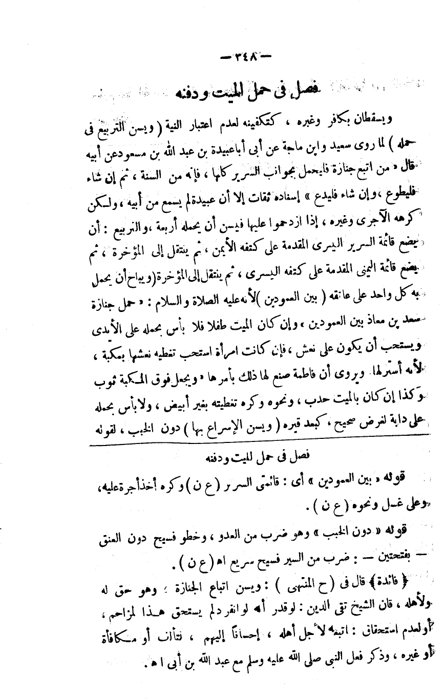 ويسقطان بكافر وغيره كتكفينه لعدم اعتبار النية (يسن التربيع في حمله) لما روى سعيد وابن ماجه عن أبي عبيدة بن عبد الله بن مسعود عن أبيه قال من اتبع جنازة فليحمل بجوانب السرير كلها فإنه من السنة ثم إن شاء فليتطوع وإن شاء فليدع إسناده ثقات إلا أن أبا عبيدة لم يسمع من أبيه لكن كرهه الآجري وغيره وإذا ازدحموا عليها فيسن أن يحمله أربعة والتربيع أن يضع قائمة السرير اليسرى المقدمة على كتفه الأيمن ثم ينتقل إلى المؤخرة ثم يضع قائمته اليمنى المقدمة على كتفه اليسرى ثم ينتقل إلى المؤخرة (ويباح) أن يحمل به كل واحد على عاتقه (بين العمودين) لأنه صلى الله عليه وسلم حمل جنازة سعد بن معاذ بين العمودين وإن كان الميت طفلا فلا بأس بحمله على الأيدي ويستحب أن يكون على نعش فإن كانت امرأة استحب تغطية نعشها بمكبة لأنه أستر لها ويروى أن فاطمة صنع لها ذلك بأمرها ويجعل فوق المكبة ثوب وكذا إن كان بالميت حدب ونحوه وكره تغطيته بغير أبيض ولا بأس بحمله على دابة لغرض صحيح كبعد قبره (ويسن الاسراع بها) دون الخبب لقول