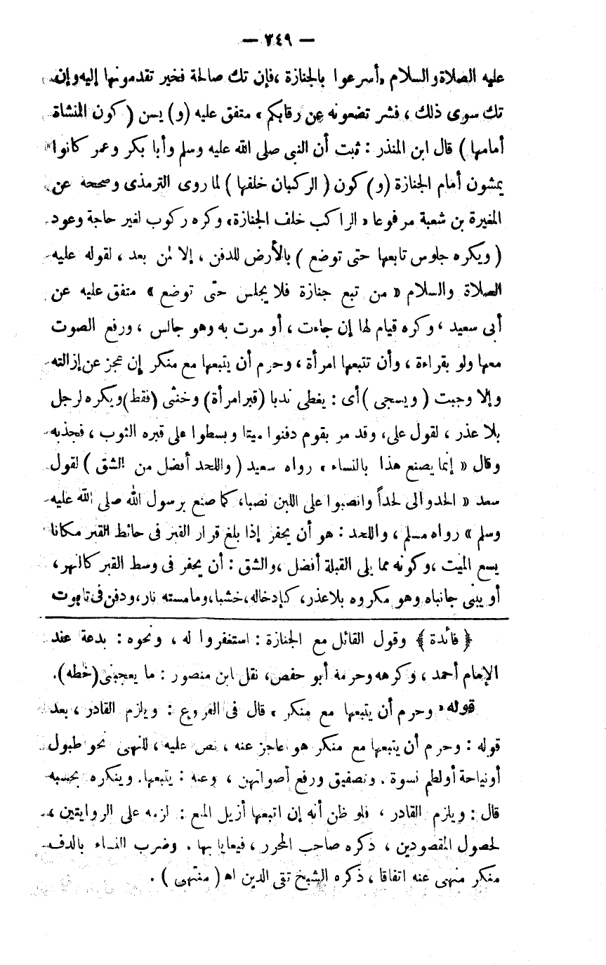 صلى الله عليه وسلم أسرعوا بالجنازة فإن تك صالحة فخير تقدمونها إليه وإن تك سوءا فشر تضعونه عن رقابكم متفق عليه ( و ) يسن ( كون المشاة أمامها ) قال ابن المنذر ثبت أن النبي صلى الله عليه وسلم وأبا بكر وعمر كانوا يمشون أمام الجنازة ( و ) كون ( الركبان خلفها ) لما روى الترمذي وصححه عن المغيرة بن شعبة مرفوعا الراكب خلف الجنازة وكره ركوب لغير حاجة وعود ( ويكره جلوس تابعها حتى توضع ) بالأرض للدفن إلا لمن بعد لقوله صلى الله عليه وسلم من تبع جنازة فلا يجلس حتى توضع متفق عليه عن أبي سعيد وكره قيام لها إن جاءت أو مرت به وهو جالس ورفع الصوت معها ولو بقراءة وأن تتبعها امرأة وحرم أن يتبعها مع منكر إن عجز عن إزالته وإلا وجبت ( ويسجى ) أي يغطى ندبا ( قبر امرأة ) وخنثى ( فقط ) ويكره لرجل بلا عذر لقول علي وقد مر بقوم دفنوا ميتا وبسطوا على قبره الثوب فجذبه وقال إنما يصنع هذا بالنساء رواه سعيد ( واللحد أفضل من الشق ) لقول سعد ألحدوا لي لحدا وانصبوا علي اللبن نصبا كما صنع برسول الله صلى الله عليه وسلم رواه مسلم واللحد هو أن يحفر إذا بلغ قرار القبر في حائط القبر مكانا يسع الميت وكونه مما يلي القبلة أفضل والشق أن يحفر في وسط القبر كالنهر ويبنى جانباه وهو مكروه بلا عذر كإدخاله خشبا وما مسته نار ودفن في تابوت