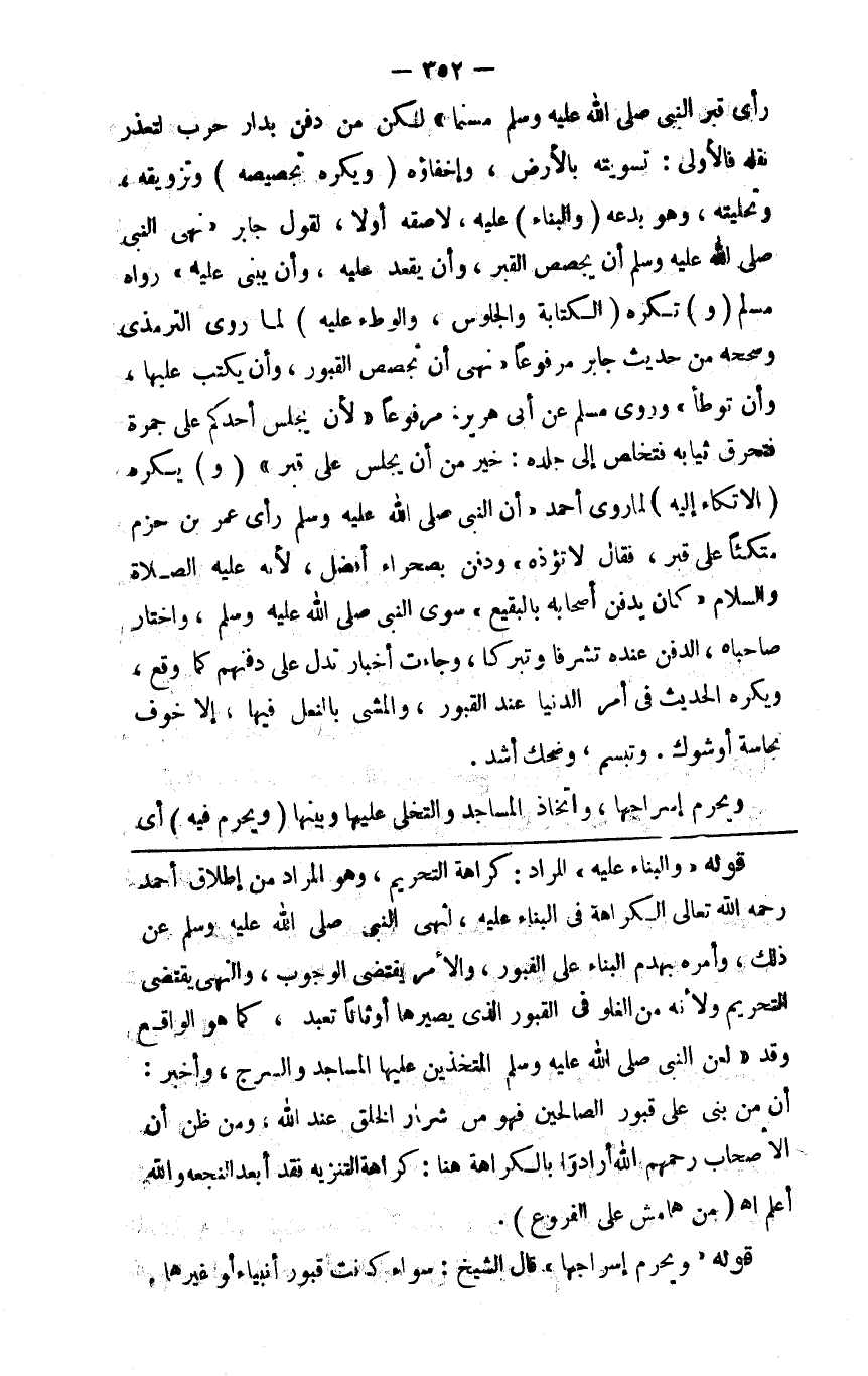 رأى قبر النبي صلى الله عليه وسلم مسنما لكن من دفن بدار حرب لتعذر نقله فالأولى تسويته بالأرض وإخفاؤه ( ويكره تجصيصه ) وتزويقه وتحليته وهو بدعة ( والبناء عليه ) لاصقة أولا لقول جابر نهى رسول الله صلى الله عليه وسلم أن يجصص القبر وأن يقعد عليه وأن يبنى عليه رواه مسلم ( و ) تكره ( الكتابة والجلوس والوطء عليه ) لما روى الترمذي وصححه من حديث جابر مرفوعا نهى أن تجصص القبور وأن يكتب عليها وأن توطأ وروى مسلم عن أبي هريرة مرفوعا لأن يجلس أحدكم على جمرة فتحرق ثيابه فتخلص إلى جلده خير من أن يجلس على قبر ( و ) يكره ( الاتكاء إليه ) لما روى أحمد أن النبي صلى الله عليه وسلم رأى عمرو بن حزم متكئا على قبر فقال لا تؤذوه ودفن بصحراء أفضل لأنه صلى الله عليه وسلم كان يدفن أصحابه بالبقيع سوى النبي صلى الله عليه وسلم واختار صاحباه الدفن عنده تشرفا وتبركا وجاءت أخبار تدل على دفنهم كما وقع ويكره الحديث في أمر الدنيا عند القبور والمشي بالنعل فيها إلا خوف نجاسة أو شوك وتبسم وضحك أشد ويحرم إسراجها واتخاذ المساجد والتخلي عليها وبينها ( ويحرم فيه ) أي