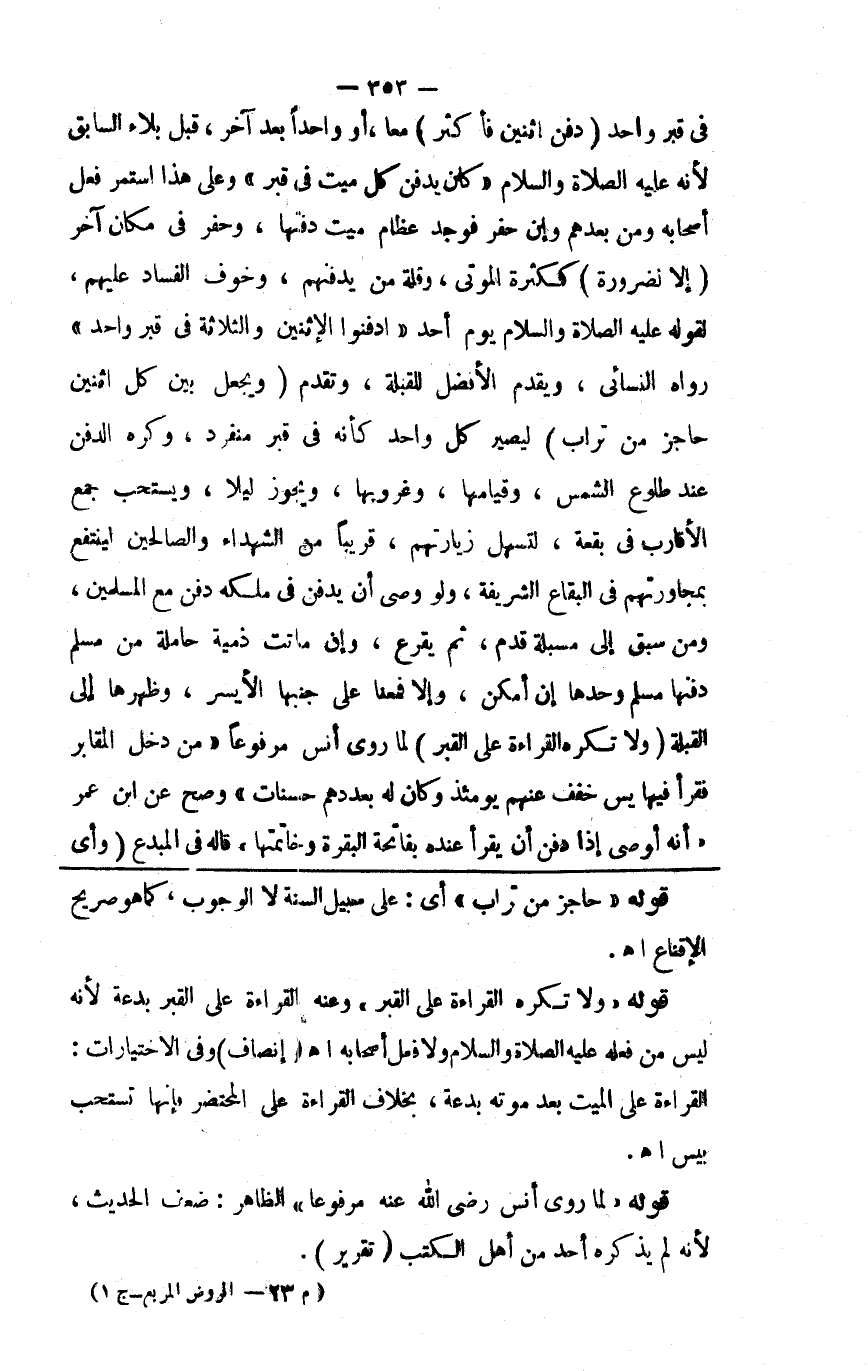 في قبر واحد ( دفن اثنين فأكثر ) معا أو واحدا بعد آخر قبل بلي السابق لأنه صلى الله عليه وسلم كان يدفن كل ميت في قبر وعلى هذا استمر فعل أصحابه ومن بعدهم وإن حفر فوجد عظام ميت دفنها وحفر في مكان آخر ( إلا لضرورة ) ككثرة الموتى وقلة من يدفنهم وخوف الفساد عليهم لقوله صلى الله عليه وسلم يوم أحد ادفنوا الاثنين والثلاثة في قبر وأحد رواه النسائى ويقدم الأفضل للقبلة وتقدم ( ويجعل بين كل اثنين حاجز من تراب ) ليصير كل واحد كأنه في قبر منفرد وكره الدفن عند طلوع الشمس وقيامها وغروبها ويجوز ليلا ويستحب جمع الأقارب في بقعة لتسهل زيارتهم قريبا من الشهداء والصالحين لينتفع بمجاورتهم في البقاع الشريفة ولو وصى أن يدفن في ملكه دفن مع المسلمين ومن سبق إلى مسبلة قدم ثم يقرع وإن ماتت ذمية حامل من مسلم دفنها مسلم وحدها إن أمكن وإلا فمعنا على جنبها الأيسر وظهرها إلى القبلة ( ولا تكره القراءة على القبر ) لما روى أنس مرفوعا من دخل المقابر فقرأ فيها يس خفف عنهم يومئذ وكان له بعددهم حسنات وصح عن ابن عمر أنه أوصى إذا دفن أن يقرأ عنده بفاتحة البقرة وخاتمتها قاله في المبدع ( وأي