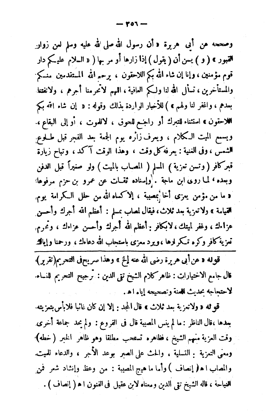 وصححه عن أبي هريرة أن رسول الله صلى الله عليه وسلم لعن زوارات القبور ( و ) يسن ( أن يقول إذا زارها أو مر بها السلام عليكم دار قوم مؤمنين وإنا إن شاء الله بكم لاحقون يرحم الله المستقدمين منكم والمستأخرين نسأل الله لنا ولكم العافية اللهم لا تحرمنا أجرهم ولا تفتنا بعدهم واغفر لنا ولهم ) للأخبار الواردة بذلك وقوله إن شاء الله بكم لاحقوق استثناء للتبرك أو راجع للحوق لا للموت أو إلى البقاع ويسمع الميت الكلام ويعرف زائره يوم الجمعة بعد الفجر قبل طلوع الشمس وفي الغنية يعرفه كل وقت وهذا الوقت آكد وتباح زيارة قبر كافر ( وتسن تعزية ) المسلم ( المصاب بالميت ) ولو صغيرا قبل الدفن وبعده لما روى ابن ماجه وإسناده ثقات عن عمرو بن حزم مرفوعا مامن مؤمن يعزي أخاه بمصيبة إلا كساه الله من حلل الكرامة يوم القيامة ولا تعزية بعد ثلاث فيقال لمصاب بمسلم أعظم الله أجرك وأحسن عزاءك وغفر لميتك وبكافر أعظم الله أجرك وأحسن عزاءك وتحرم تعزية كافر وكره تكرارها ويرد معزى استجاب الله دعاك ورحمنا وإياك