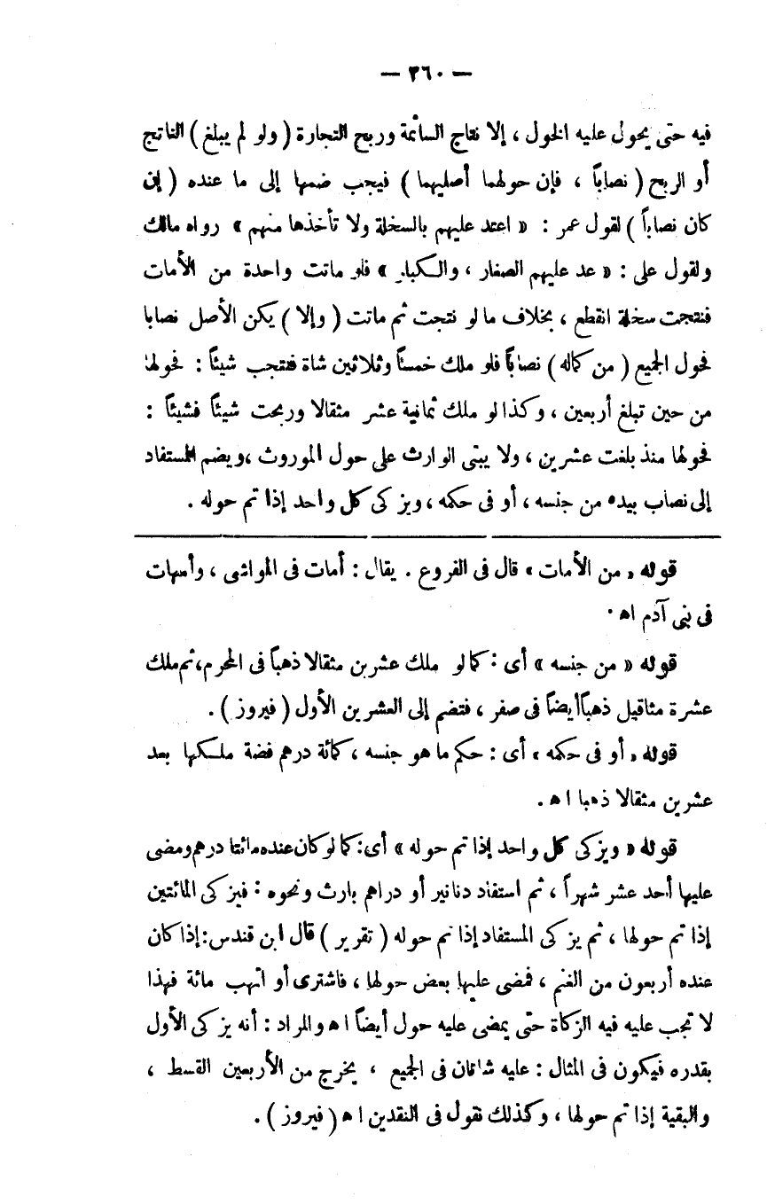 في مال حتى يحول عليه الحول رواه ابن ماجه ورفقا بالملك ليتكامل النماء فيواسي منه ويعفى فيه عن نصف يوم ( في غير المعشر ) أي الحبوب والثمار لقوله تعالى { وآتوا حقه يوم حصاده } وكذا المعدن والركاز والعسل قياسا عليهما فإن استفاد مالا بإرث أوهبة ونحوهما فلا زكاة فيه حتى يحول عليه الحول ( إلا نتاج السائمة وربح التجارة ولو لم يبلغ ) النتاج أو الربح ( نصابا فإن حولهما حول أصلهما ) فيجب ضمها إلى ما عنده ( إن كان نصابا ) لقول عمر اعتد عليهم بالسخلة ولا تأخذها منهم رواه مالك ولقول علي عد عليهم الصغار والكبار فلو ماتت واحدة من الأمهات فنتجت سخلة انقطع بخلاف مالو نتجت ثم ماتت ( وإلا ) يكن الأصل نصابا ( ف ) حول الجميع ( من كماله ) نصابه فلو ملك خمسا وثلاثين شاة فنتجت شيئا فشيئا فحولها من حين تبلغ أربعين وكذا لو ملك ثمانية عشر مثقالا وربحت شيئا فشيئا فحولها منذ بلغت عشرين ولا يبني الوارث على حول الموروث ويضم المستفاد إلى نصاب بيده من جنسه أو في حكمه ويزكي كل واحد إذا تم حوله