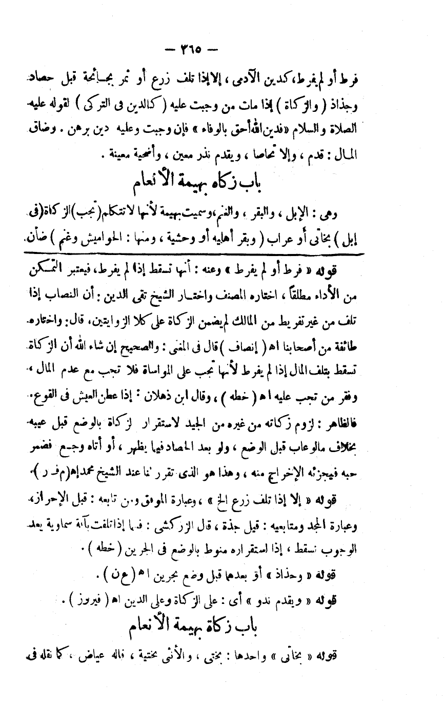 وهي الإبل والبقر والغنم وسميت بهيمة لأنها لا تتكلم (تجب) الزكاة (في إبل) بخاتي أو عراب (وبقر) أهلية أو وحشية ومنها الجواميس (وغنم) ضأن أ