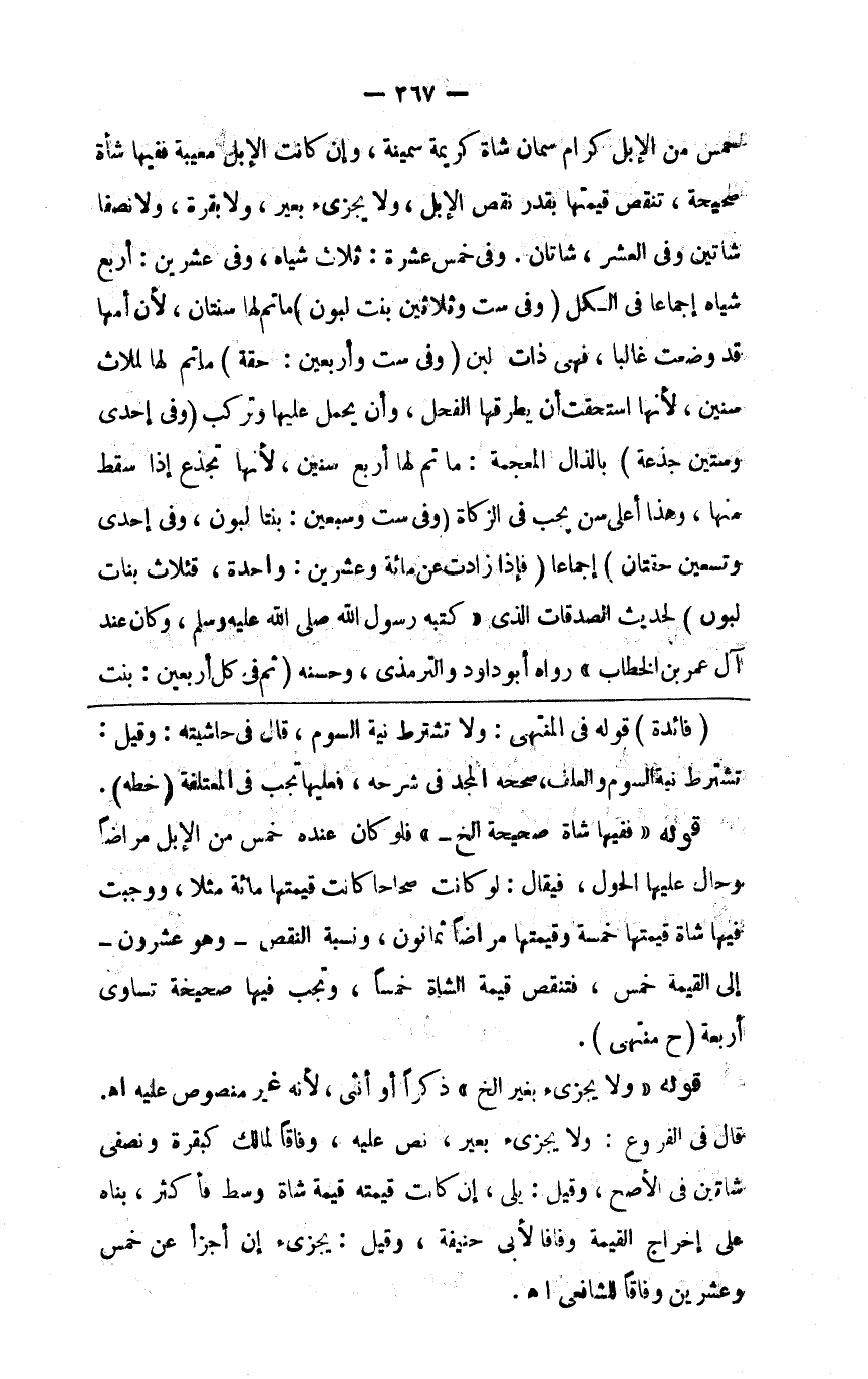 7 خمس من الإبل كرام سمان شاة كريمة سمينة فإن كانت الإبل معيبة ففيها شاة صحيحة تنقص قيمتها بقدر نقص الإبل ولا يجزئ بعير ولا بقرة ولانصفا شاتين وفي العشر شاتان وفي خمس عشرة ثلاث شياه وفي عشرين أربع شياه إجماعا في الكل ( وفي ست وثلاثين بنت