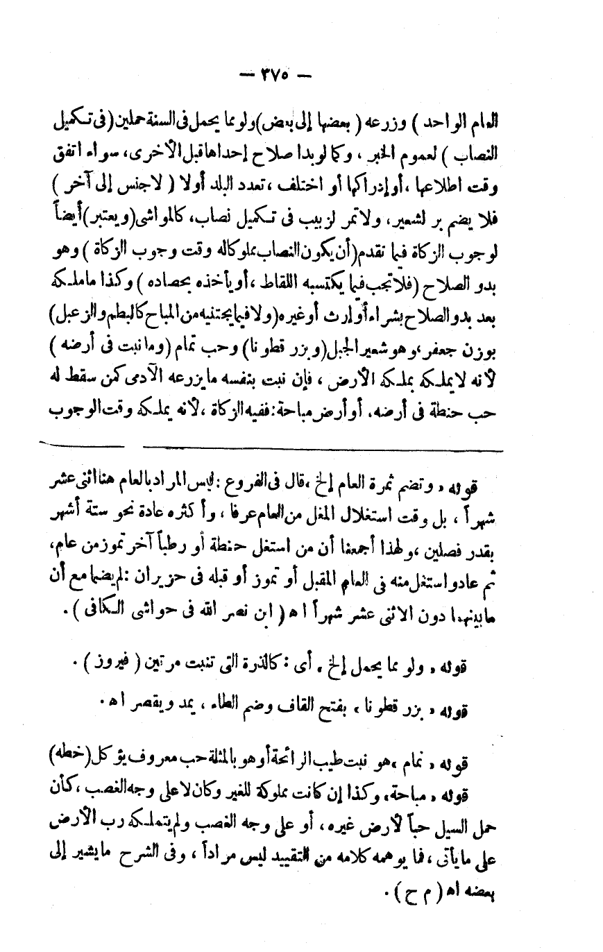 العام الواحد ) وزرعه ( بعضها إلى بعض ) ولو مما يحمل في السنة حملين ( في تكميل النصاب ) لعموم الخبر وكما لو بدأ صلاح إحداها قبل الأخرى سواء اتفق وقت إطلاعها وإدراكها أو اختلف تعدد البلد أو لا ( لاجنس إلى آخر ) فلا يضم بر لشعير ولاتمر لزبيب في تكميل نصاب كالمواشي ( ويعتبر ) أيضا لوجوب الزكاة فيما تقدم ( أن يكون النصاب مملوكا له وقت وجوب الزكاة ) وهو بدو الصلاح ( فلا تجب فيما يكتسبه اللقاط أو يأخذه بحصاده ) وكذا ماملكه بعد بدو الصلاح بشراء أو إرث أو غيره ( ولا فيما يجتنبه من المباح كالبطم والزعبل ) بوزن جعفر وهو شعير الجبل ( وبزر قطون ) وحب تمام ( ولو نبت في أرضه ) لأنه لا يملك بملك الأرض فإن نبت بنفسه ما يزرعه الآدمي كمن سقط له حب حنطة في أرضه أو أرض مباحة ففيه الزكاة لأنه يملكه وقت الوجوب