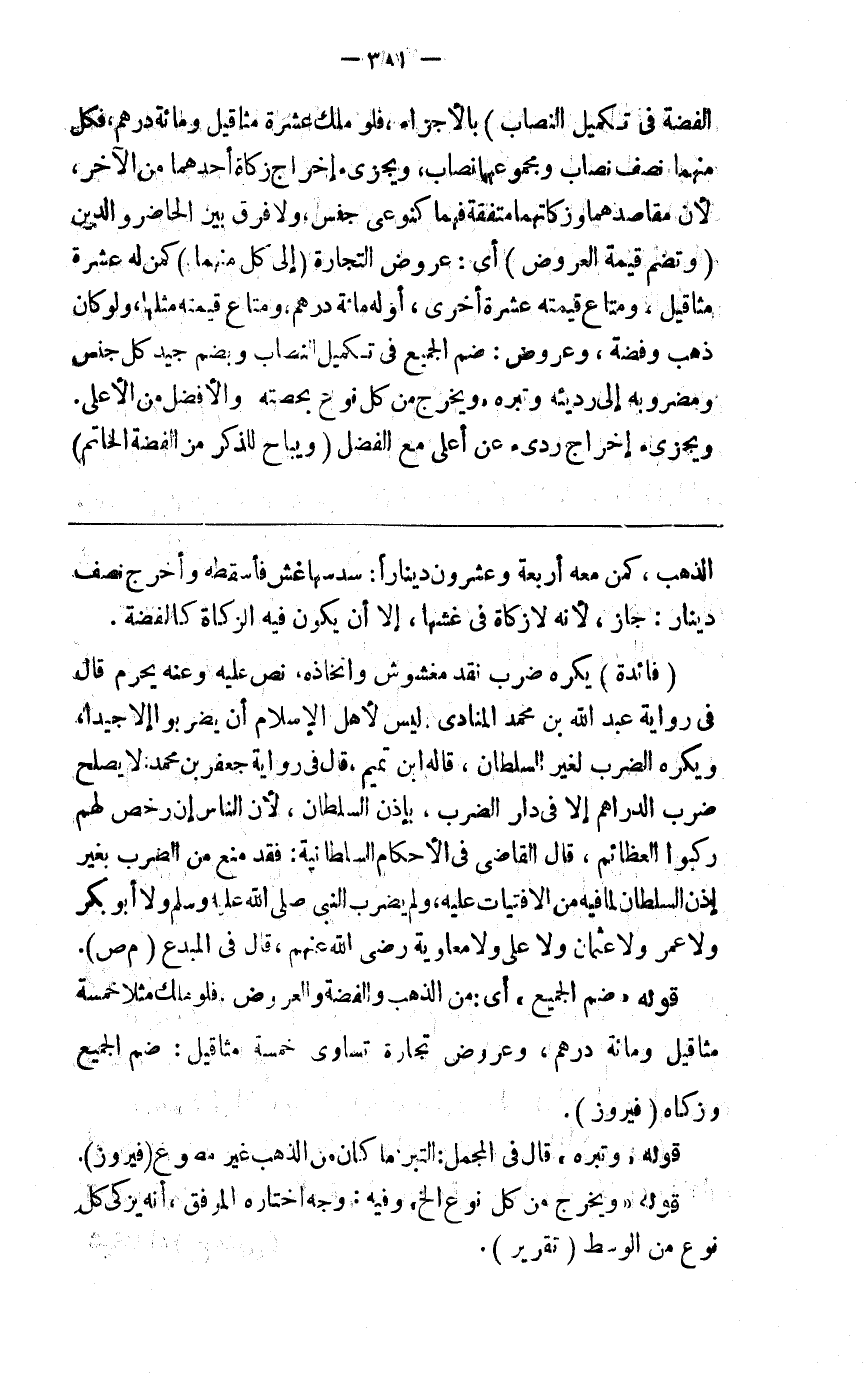 الفضة في تكميل النصاب ) بالأجزاء فلو ملك عشرة مثاقيل ومائة درهم فكل منهما نصف نصاب ومجموعهما نصاب ويجزئ إخراج زكاة أحدها من الآخر لأن مقاصدهما وزكاتهما متفقة فهما كنوعي جنس ولا فرق بين الحاضر والدين ( وتضم قيمة العروض ) أي عروض التجارة ( إلى كل منهما ) كمن له عشرة مثاقيل ومتاع قيمته عشرة أخرى أو له مائة درهم ومتاع قيمته مثلها ولو كان ذهب وفضة وعروض ضم الجميع في تكميل النصاب ويضم جيد كل جنس ومضروبه إلى رديئه وتبره ويخرج من كل نوع بحصته والأفضل من الأعلى ويجزئ إخراج رديء عن أعلى مع الفضل ( ويباح للذكر من الفضة الخاتم )