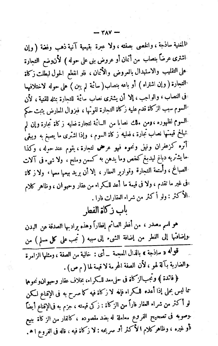 المغنية ساذجة والخصي بصفته ولا عبرة بقيمة آنية ذهب و فضة (وإن اشترى عرضا بنصاب من أثمان أو عروض بني على حوله) لأن وضع التجارة على التقليب والاستبدال بالعروض والأثمان فلو انقطع الحول لبطلت زكاة التجارة (وإن اشتراه) أو باعه (ب) نصاب (سائمة لم يبين) على حوله لاختلافهما في النصاب والواجب إلا أن يشتري نصاب سائمة للتجارة بمثله للقنية لأن السوم سبب للزكاة قدم عليه زكاة التجارة لقوتها فبزوال المعارض يثبت حكم السوم لظهوره ومن ملك نصابا من السائمة لتجارة فعليه زكاة تجارة وإن لم تبلغ قيمتها نصاب تجارة فعليه زكاة السوم وإذا اشترى ما يصبغ به ويبقى أثره كزعفران ونيل ونحوه فهو عرض تجارة يقوم عند حوله وكذا ما يشتريه دباغ ليدبغ به كعفص وما يدهن به كسمن وملح ولا شيء في آلات الصباغ وأمتعة التجارة وقوارير العطار إلا أن يريد بيعها معها ولا زكاة في غير ما تقدم ولا في قيمة ما أعد للكراء من عقار وحيوان وظاهر كلام الأكثر ولو أكثر من شراء العقارات فارا