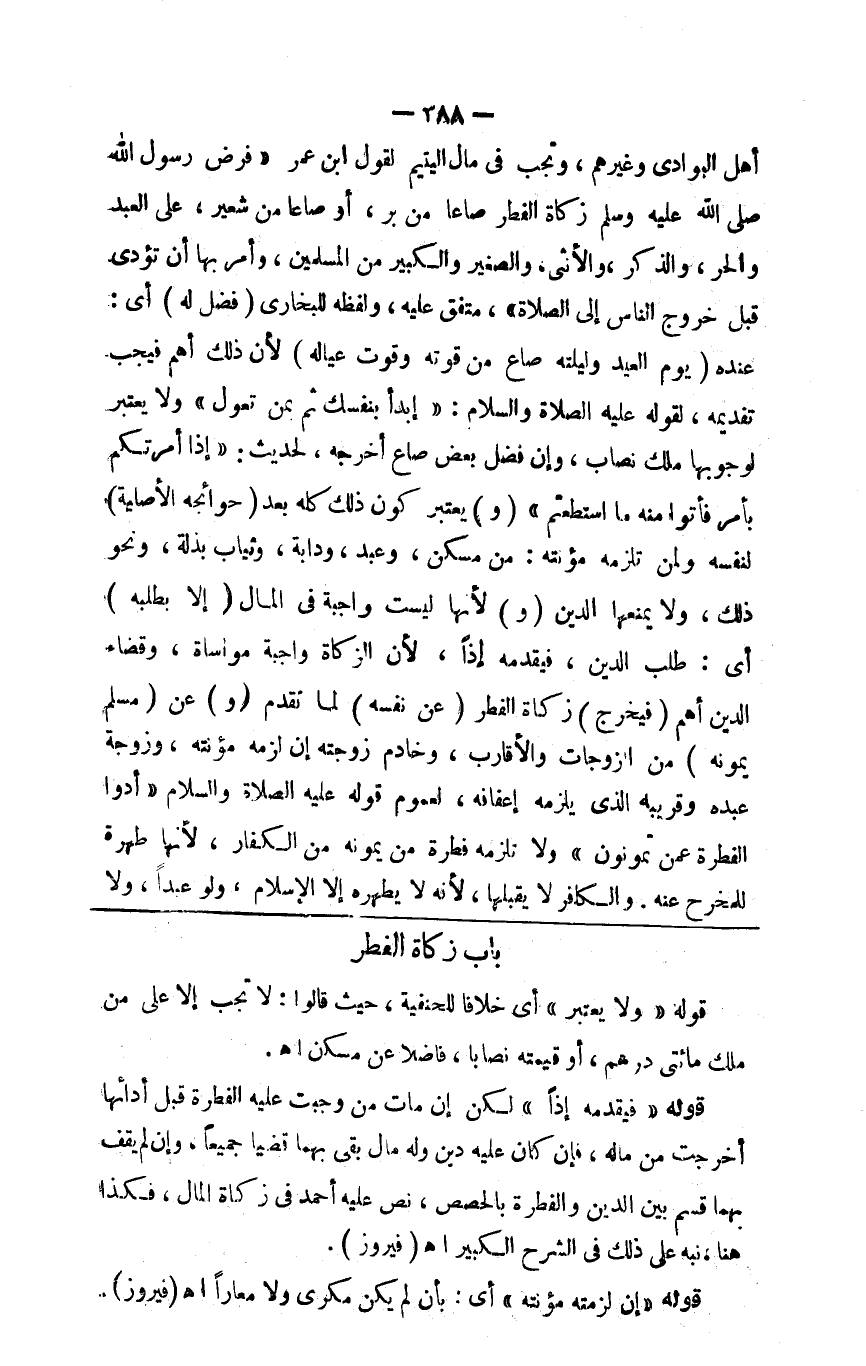 أهل البوادي وغيرهم وتجب في مال يتيم لقول ابن عمر فرض رسول الله صلى الله عليه وسلم زكاة الفطر صاعا من بر أو صاعا من شعير على العبد والحر والذكر والأنثى والصغير والكبير من المسلمين وأمر بها أن تؤدى قبل خروج الناس إلى الصلاة متفق عليه ولفظه للبخاري ( فضل له ) أي عنده ( يوم العيد وليلته صاع عن قوته وقوت عياله ) لأن ذلك أهم فيجب تقديمه لقوله صلى الله عليه وسلم ابدأ بنفسك ثم بمن تعول ولا يعتبر لوجوبها ملك نصاب وإن فضل بعض صاع أخرجه لحديث إذا أمرتكم بأمر فأتوا منه ما استطعتم ( و ) يعتبر كون ذلك كله بعد ( حوائجه الأصلية ) لنفسه أو لمن تلزمه مؤونته من مسكن وعبد ودابة وثياب بذلة ونحو ذلك ( لا يمنعها الدين ) لأنها ليست واجبة في المال ( إلابطلبه ) أي طلب الدين فيقدمه إذا لأن الزكاة واجبة مواساة وقضاء الدين أهم الذين يخرج عنهم الزكاة ( فيخرج ) زكاة الفطر ( عن نفسه ) لما تقدم ( و ) عن ( مسلم يمونه ) من الزوجات والأقارب وخادم زوجته إن لزمته مؤونته وزوجة عبده الحرة وقريبه الذي يلزمه إعفافه لعموم قوله صلى الله عليه وسلم أدوا الفطر عمن تمونون ولا تلزمه فطرة من يمونه من الكفار لأنها طهرة للمخرج عنه والكافر لا يقبلها لأنه لا يطهره إلا الإسلام ولو عبدا