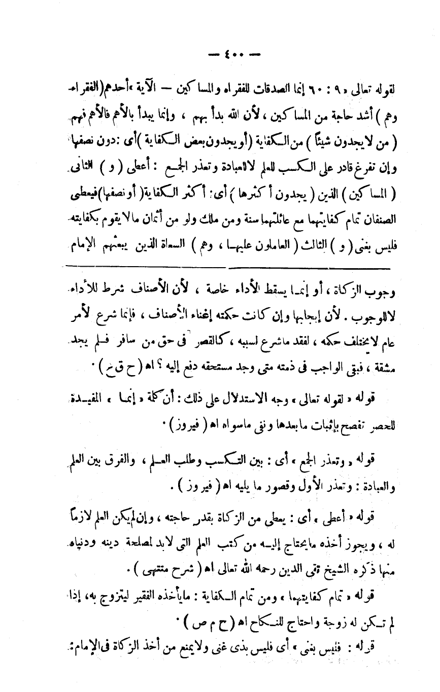 لقوله تعالى { إنما الصدقات للفقراء والمساكين } الآية أحدهم ( الفقراء وهم ) أشد حاجة من المساكين لأن الله بدأ بهم وإنما يبدأ بالأهم فالأهم فهم ( من لا يجدون شيئا ) من الكفاية ( أو يجدون بعض الكفاية ) أي دون نصفها وإن تفرغ قادر على التكسب للعلم لا للعبادة وتعذر الجمع أعطي ( و ) الثاني ( المساكين ) الذين ( يجدون أكثرها ) أي أكثر الكفاية ( أو نصفها ) فيعطى الصنفان تمام كفايتهما مع عائلتهما سنة ومن ملك ولو من أثمان ما لا يقوم بكفايته فليس بغني ( و ) الثالث ( العاملون عليها وهم ) السعاة الذين يبعثهم الإمام