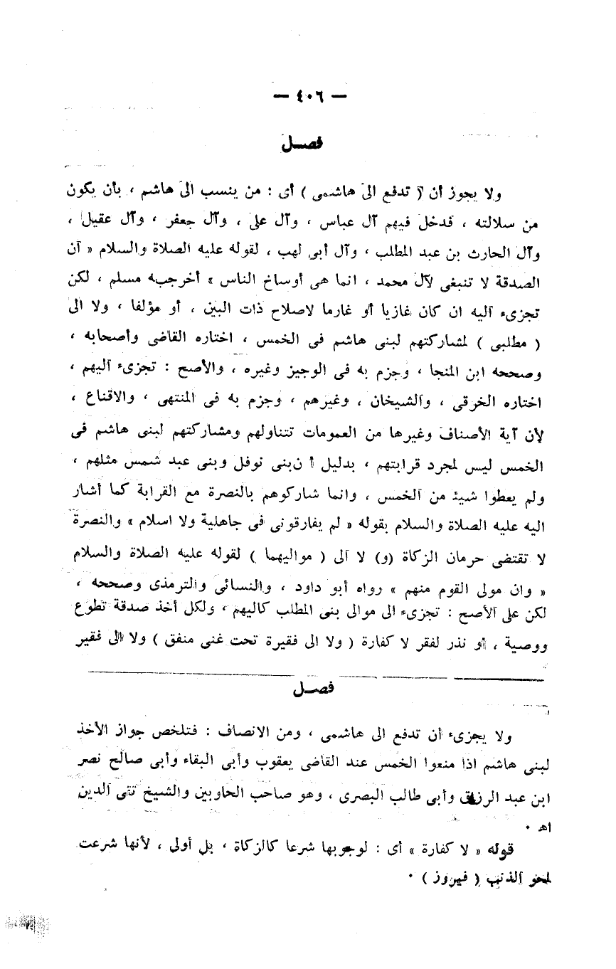 (ولا) يجزئ أن (تدفع إلى هاشمي) أي من ينسب إلى هاشم بأن يكون من سلالته فدخل فيهم آل عباس وآل علي وآل جعفر وآل عقيل وآل الحارث بن عبد المطلب وآل أبي لهب لقوله صلى الله عليه وسلم إن الصدقة لا تنبغي لآل محمد إنما هي أوساخ الناس أخرجه مسلم لكن تجزىء إليه إن كان غازيا أو غارما لإصلاح ذات البين أو مؤلفا (و) لا إلى (مطلبي) لمشاركتهم لبني هاشم في الخمس اختاره القاضي وأصحابه وصححه ابن المنجا وجزم به في الوجيز وغيره والأصح تجزئ إليهم اختاره الخرقي والشيخان وغيرهم لأن آية الأصناف وغيرها من العمومات تتناولهم ومشاركتهم لبني هاشم في الخمس ليس لمجرد قرابتهم بدليل أن بني نوفل وبني عبد شمس مثلهم ولم يعطوا شيئا من الخمس إنما شاركوهم بالنصرة مع القرابة كما أشار إليه صلى الله عليه وسلم بقوله لم يفارقوني في جاهلية ولا إسلام والنصرة لا تقتضي حرمان الزكاة (و) لا إلى (مواليهما) لقوله صلى الله عليه وسلم وإن مولى القوم منهم رواه أبو داود والنسائي والترمذي وصححه ولكن على الأصح تجزئ إلى موالي بني المطلب كإليهم ولكن أخذ صدقة تطوع ووصية أو نذر لفقر لا كفارة (ولا إلى فقيرة تحت غني منفق) ولا إلى فقي