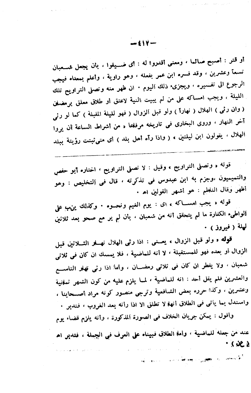 سحاب أو قتر أصبح صائما ومعنى أقدروا له أي ضيقوا بأن يجعل شعبان تسعا وعشرين وقد فسره ابن عمر بفعله صلى الله عليه وسلم وهو راوية وأعلم بمعناه فيجب الرجوع إلى تفسيره ويجزئ صوم ذلك اليوم إن ظهر منه وتصلى التراويح تلك الليلة ويجب إمساكه على من لم يبيت بنيته لا عتق أو طلاق معلق برمضان ( وإن رؤي ) الهلال ( نهارا ) ولو قبل الزوال ( فهو لليلة المقبلة ) كما لو رؤي آخر النهار وروى البخاري في تاريخه مرفوعا من أشراط الساعة أن يروا الهلال يقولون ابن ليلتين ( وإذا رآه أهل بلد ) أي متى ثبتت رؤيته