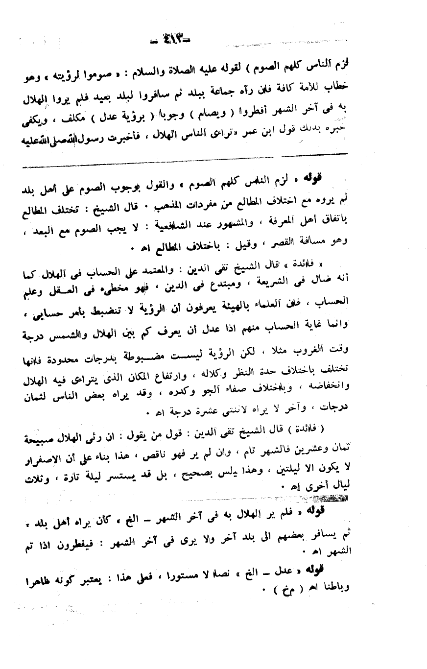 ببلد ( لزم الناس كلهم الصوم ) لقوله صلى الله عليه وسلم صوموا لرؤيته وهو خطاب للأمة كافة فإن رآه جماعة ببلد ثم سافروا لبلد بعيد فلم ير الهلال به في آخر الشهر أفطروا ( ويصام ) وجوبا ( برؤية عدل ) مكلف ويكفي خبره