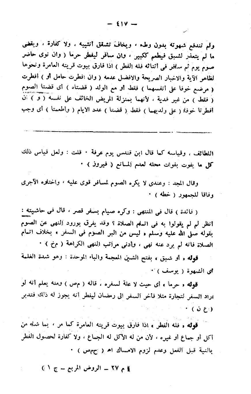 مرض ينتفع به فيه ولاكفارة فيه أو به شبق ولم تندفع شهوته بدون وطء ويخاف تشقق أنثييه ولا كفارة ويقضي ما لم يتعذر لشبق فيطعم كالكبير وإن سافر ليفطر حرم ( وإن نوى حاضر صوم يوم ثم سافر في أثنائه فله الفطر ) إذا فارق بيوت قريته ونحوها لظاهر الآية والأخبار الصريحة والأفضل عدمه ( وإن أفطرت حامل أو ) أفطرت ( مرضع خوفا على أنفسهما فقط أو مع الولد ( قضتاه ) أي قضتا الصوم ( فقط ) من غير فدية لأنهما بمنزلة المريض الخائف على نفسه ( و ) إن أفطرتا خوفا ( على ولديهما ) فقط ( قضتا ) عدد الأيام