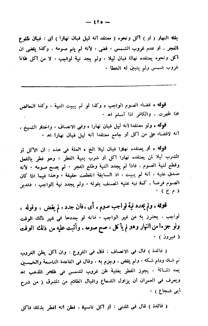 ولم يتبين بعد ذلك أنها غربت فعليه قضاء الصوم الواجب لأن الأصل بقاء النهار ( أو ) أكل ونحوه ( معتقدا أنه ليل فبان نهارا ) أي فبان طلوع الفجر أو عدم غروب الشمس قضى لأنه لم يتم صومه وكذا يقضي إن أكل ونحوه يعتقد نهارا فبان ليلا ولم يجد نية الواجب لا من أكل ظانا غروب شمس ولم يتبين له الخطأ %