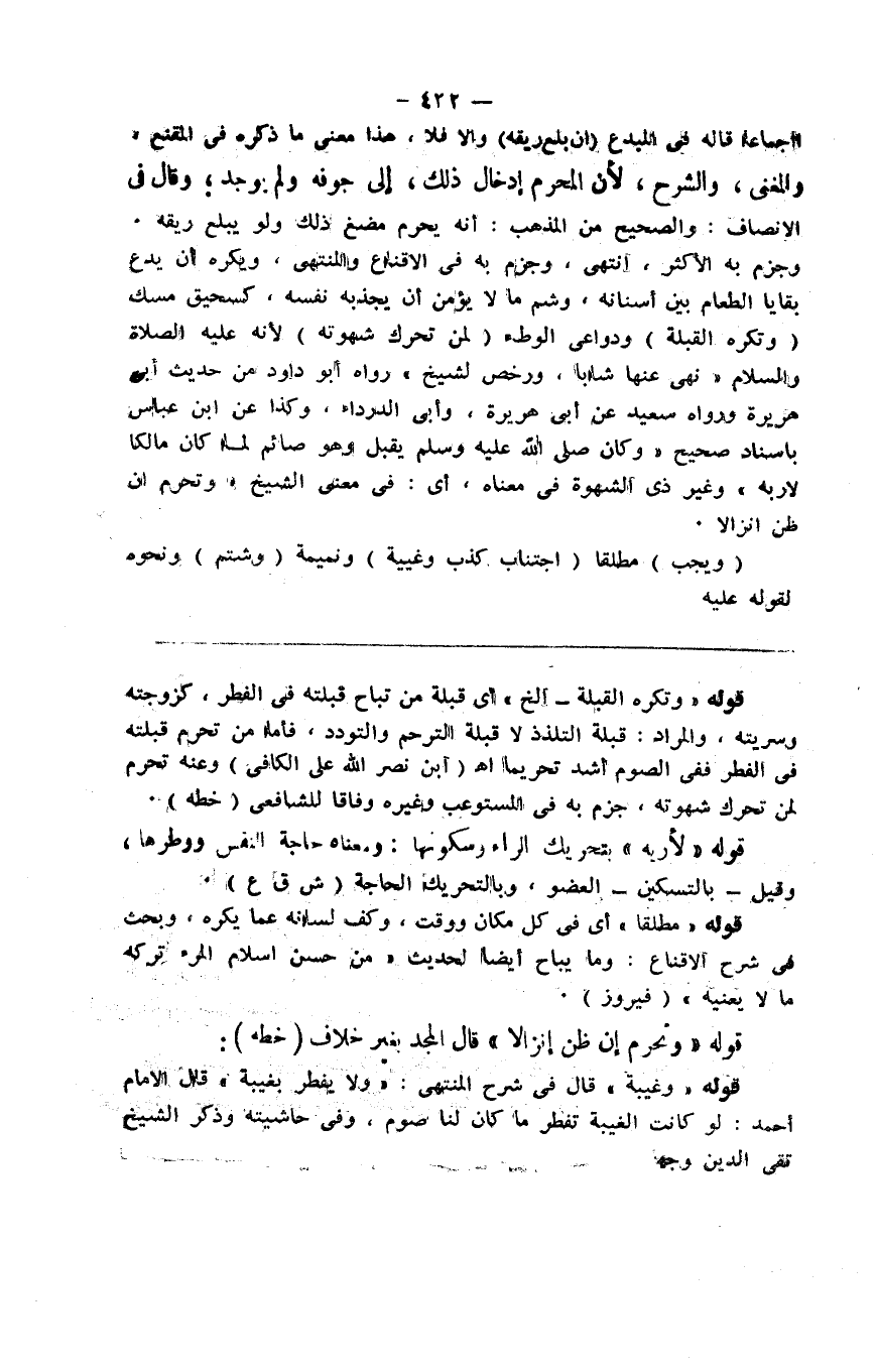 وإلا فلا هذا معنى ما ذكره في المقنع و المغني و الشرح لأن المحرم إدخال ذلك إلى جوفه ولم يوجد وقال في الإنصاف والصحيح من المذهب أنه يحرم مضغ ذلك ولو لم يبتلع ريقه وجزم به الأكثر اه وجزم به في الإقناع و المنتهى ويكره أن يدع بقايا الطعام بين أسنانه وشم مالا يؤمن أن يجذبه نفسه كسحيق مسك ( وتكره القبلة ) ودواعي الوطء ( لمن تحرك شهوته ) لأنه صلى الله عليه وسلم نهي عنها شابا ورخص لشيخ رواه أبو داود من حديث أبي هريرة ورواه سعيد عن أبي هريرة وأبي الدرداء وكذا عن ابن عباس بإسناد صحيح وكان صلى الله عليه وسلم يقبل وهو صائم لما كان مالكا لإربه وغير ذي الشهوة في معناه أي في معنى الشيخ وتحرم إن ظن إنزالا ( ويجب ) مطلقا ( اجتناب كذب وغيبة ) ونميمة ( وشتم ) ونحوه لقوله عليه