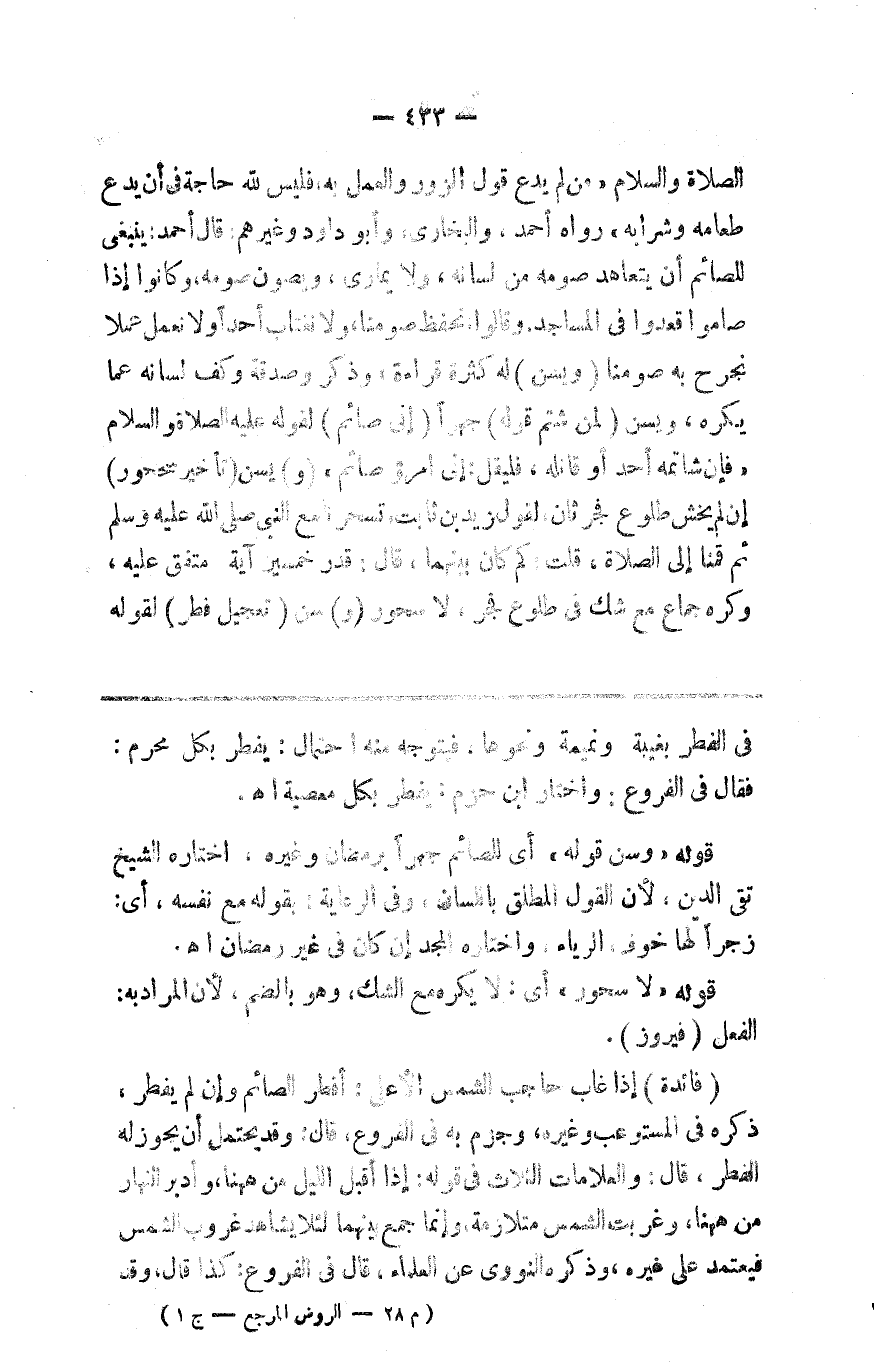 الصلاة والسلام من لم يدع قول الزور والعمل به فليس لله حاجة في أن يدع طعامه وشرابه رواه أحمد والبخاري وأبو داود وغيرهم قال أحمد ينبغي للصائم أن يتعاهد صومه من لسانه ولا يماري ويصون صومه وكانوا إذا صاموا قعدوا في المساجد وقالوا نحفظ صومنا ولا نغتاب أحدا ولا يعمل عملا يجرح به صومه ويسن له كثرة قراءة وذكر وصدقة وكف لسانه عما يكره ( وسن لمن شتم قوله ) جهرا ( إني صائم ) لقوله صلى الله عليه وسلم فإن شاتمه أحد أو قاتله فليقل إني امرؤ صائم ويسن ( تأخير سحور ) إن لم يخش طلوع فجر ثان لقول زيد بن ثابت تسحرنا مع النبي صلى الله عليه وسلم ثم قمنا إلى صلاة قلت كم كان بينهما قال قدر خمسين آية متفق عليه وكره جماع مع شك في طلوع فجر لا سحور ( و ) يسن تعجل فطر ) لقوله