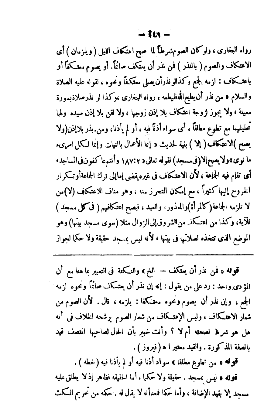 رواه البخاري ولو كان الصوم شرطا لما صح اعتكاف الليل ( ويلزمان ) أي الاعتكاف والصوم ( بالنذر ) فمن نذر أن يعتكف صائما أو يصوم معتكفا لزمه الجمع وكذا لو نذر أن يصلي معتكفا ونحوه لقوله صلى الله عليه وسلم من نذر أن يطيع الله فليطعه رواه البخارى وكذا لو نذر صلاة بسورة معينة ولايجوز لزوجه اعتكاف بلا إذن زوجها ولا لقن بلا إذن سيده ولهما تحليلهما من تطوع مطلقا أي سواء أذنا فيه أو لم يأذنا ومن نذر بلا إذن ( ولا يصح ) الاعتكاف ( إلا ) بنية لحديث إنما الأعمال بالنيات ولايصح إلا ( في مسجد ) لقوله تعالى { وأنتم عاكفون في المساجد } يجمع فيه أي تقام فيه الجماعة لأن الاعتكاف في غيره يفضي إما إلى ترك الجماعة أو تكرار الخروج إليها كثيرا مع إمكان التحرز منه وهو مناف للاعتكاف ( إلا ) من لاتلزمه الجماعة ك ( المرأة ) والمعذور والعبد ( ف ) يصح اعتكافهم ( في كل مسجد ) للآية وكذا من اعتكف من الشروق إلى الزوال مثلا ( سوى مسجد بيتها ) وهو الموضع الذي تتخذه لصلاتها في بيتها لأنه ليس بمسجد حقيقة ولا حكما لجواز
