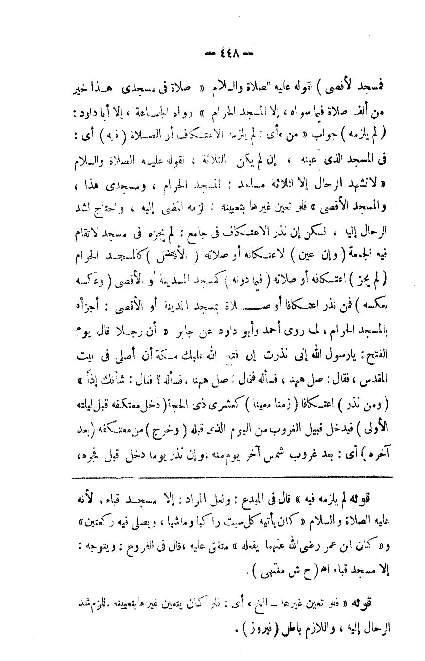 فمسجدالأقصى لقوله صلى الله عليه وسلم صلاة في مسجدي هذا خير من ألف صلاة فيما سواه إلا المسجد الحرام رواه الجماعة إلا أبا داود ( لم يلزمه ) جواب من أي لم يلزمه الاعتكاف أو الصلاة ( فيه ) أي في المسجد الذي عينه إن لم يكن من الثلاثة لقوله صلى الله عليه وسلم لاتشد الرحال إلا إلى ثلاثة مساجد المسجد الحرام ومسجدي هذا والمسجد الأقصى فلو تعين غيرها بتعيينه لزمه المضي إليه واحتاج لشد الرحال إليه لكن إن نذر الاعتكاف في جامع لم يجزئه في مسجد لاتقام فيه الجمعة ( وإن عين ) لاعتكافه أو صلاته ( الأفضل ) كالمسجد الحرام ( لم يجز ) اعتكافه أو صلاته ( فيما دونه كمسجد المدينة أو الأقصى ( وعكسه بعكسه ) فمن نذر اعتكافا أو صلاة بمسجد المدينة أو الأقصى أجزأه بالمسجد الحرام لما روى أحمد وأبو داود عن جابر أن رجلا قال يوم الفتح يا رسول الله إني نذرت إن فتح الله عليك مكة أن أصلي في بيت المقدس فقال صل ها هنا فسأله فقال صل ها هنا فسأله فقال شأنك إذا ( ومن نذر ) اعتكافا ( زمنا معينا ) كعشر ذي الحجة ( دخل معتكفه قبل ليلته الأولى ) فيدخل قبيل الغروب من اليوم الذي قبله ( وخرج ) من معتكفه ( بعد آخره ) أي بعد غروب الشمس آخر يوم منه وإن نذر يوما دخل قبل فجره