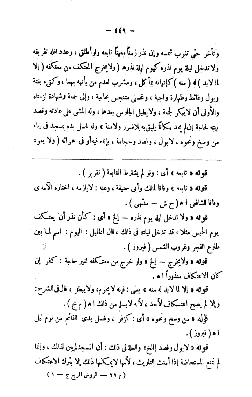 وتأخر حتى تغرب شمسه وإن نذر زمنا معينا تابعه ولو أطلق وعددا فله تفريقه ولا تدخل ليلة يوم نذره كيوم ليلة نذرها ( ولا يخرج المعتكف ) من معتكفه ( إلا لما لابد ) له ( منه ) كإتيانه بمأكل ومشرب لعدم من يأتيه بهما وكقيىء بغتة وبول وغائط وطهارة واجبة وغسل متنجس يحتاجه وإلى جمعة وشهادة لزمتاه والأولى أن لايبكر لجمعة ولا يطيل الجلوس بعدها وله المشي على عادته وقصد بيته لحاجته إن لم يجد مكانا يليق به بلا ضرر ولا منة وغسل يده بمسجد في إناء من وسخ ونحوه لابول وفصد وحجامة بإناء فيه أو في هوائه ( ولا يعود