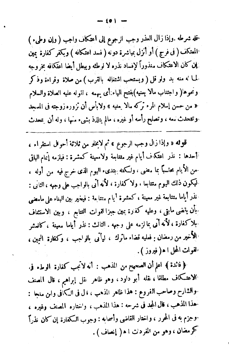 فله شرطه وإذا زال العذر وجب الرجوع إلى اعتكاف واجب ( وإن وطىء ) المعتكف ( في فرج ) أو أنزل بمباشرة دونه ( فسد اعتكافه ) ويكفر كفارة يمين إن كان الاعتكاف منذورا لإفساد نذره لا لوطئه ويبطل أيضا اعتكافه بخروجه لما له منه بد ولو قل ( ويستحب اشتغاله بالقرب ) من صلاة وقراءة وذكر ونحوها ( واجتناب مالا يعنيه ) بفتح الياء أي يهمه لقوله صلى الله عليه وسلم من حسن إسلام المرء تركه مالا يعنيه ولا بأس أن تزوره زوجته في المسجد وتتحدث معه وتصلح رأسه أو غيره ما لم يتلذذ بشيء منها وله أن يتحدث