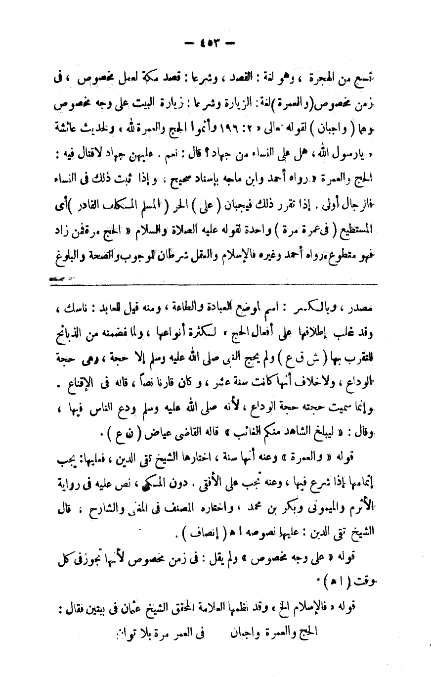 ب تسع من الهجرة وهو لغة القصد وشرعا قصد مكة لعمل مخصوص في زمن مخصوص ( والعمرة ) لغة الزيارة وشرعا زيارة البيت على وجه مخصوص وهما ( واجبان ) لقوله تعالى { وأتموا الحج والعمرة لله } ولحديث عائشة يا رسول الله هل على النساء من جهاد قال نعم عليهن جهاد لا قتال فيه الحج والعمرة رواه أحمد وابن ماجه بإسناد صحيح وإذا ثبت ذلك في النساء فالرجال أولى إذا تقرر ذلك فيجبان ( على المسلم الحر المكلف القادر ) أي المستطيع ( في عمره مرة ) واحدة لقوله صلى الله عليه وسلم الحج مرة فمن زاد فهو متطوع رواه أحمد وغيره فالإسلام والعقل شرطان للوجوب والصحة والبلوغ وكمال