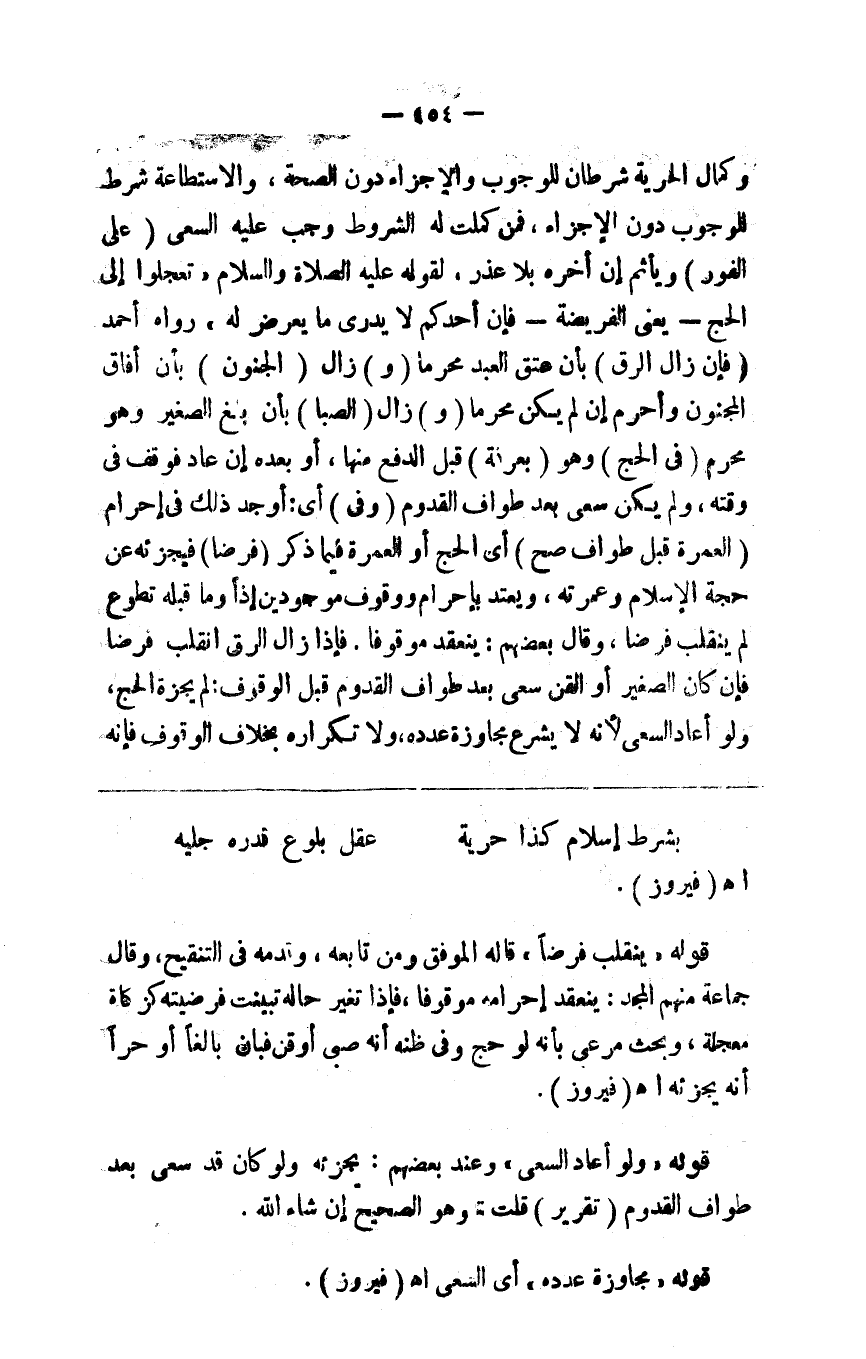 الحرية شرطان للوجوب والأجزاء دون الصحة والاستطاعة شرط للوجوب دون الإجزاء فمن كملت له الشروط وجب عليه السعي ( على الفور ) ويأثم إن أخره بلا عذر لقوله صلى الله عليه وسلم تعجلوا إلى الحج يعني الفريضة فإن أحدكم لا يدري مايعرض له رواه أحمد ( فإن زال الرق ) بأن عتق العبد محرما ( و ) زال ( الجنون ) بأن أفاق المجنون وأحرم إن لم يكن محرما ( و ) زال ( الصبا ) بأن بلغ الصغير وهو محرم ( في الحج ) وهو ( بعرفة ) قبل الدفع منها أو بعده إن عاد فوقف في وقته ولم يكن سعى بعد طواف القدوم ( وفي ) أي وجد ذلك في إحرام ( العمرة قبل طوافها صح ) أي الحج والعمرة فيما ذكر ( فرضا ) فتجزيه عن حجة الإسلام وعمرته ويعتد بإحرام ووقوف موجودين إذا وما قبله تطوع لم ينقلب فرضا وقال بعضهم ينعقد موقوفا فإذا زال الرق انقلب فرضا فإن كان الصغير أو القن سعى بعد طواف القدوم قبل الوقوف لم يجزئه الحج ولو أعاد السعي لأنه لايشرع مجاوزة عدده ولا تكراره بخلاف الوقوف فإنه