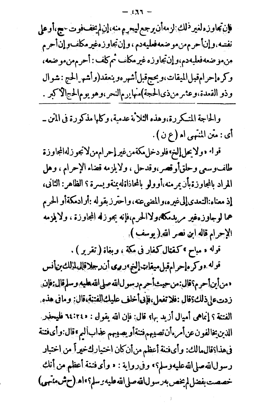 لقتال مباح أو خوف أو حاجة تتكرر كحطاب ونحوه فإن تجاوزه لغير ذلك لزمه أن يرجع ليحرم منه إن لم يخف فوت حج أو على نفسه وإن أحرم من موضعه فعليه دم وإن تجاوزه غير مكلف أحرم من موضعه وكره إحرام قبل ميقات وبحج قبل أشهره وينعقد ( وأشهر الحج شوال وذو القعدة وعشر من ذي الحجة ) منها يوم النحر وهو يوم الحج الأكبر
