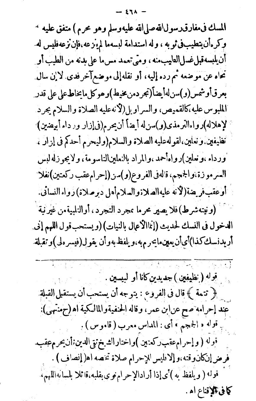المسك في مفارق رسول الله صلي الله وعليه وآله وسلم وهو محرم متفق عليه وكره أن يتطيب في ثوبه وله استدامة لبسه ما لم ينزعه فإن نزعه فليس له أن يلبسه قبل غسل الطيب منه ومتى تعمد مس ما على بدنه من الطيب أو نحاه عن موضعه ثم رده إليه أو نقله إلى موضع آخر فدى لا إن سال بعرق أو شمس ( و ) سن له أيضا ( تجرد من مخيط ) وهو كل مايخاط على قدر الملبوس عليه كالقميص والسراويل لأنه صلى الله عليه وسلم تجرد لإهلاله رواه الترمذي ( و ) سن له أيضا أن ( يحرم في إزار ورداء أبيضين ) نظيفين ونعلين لقوله صلى الله عليه وسلم وليحرم أحدكم في إزار ورداء ونعلين رواه أحمد والمراد بالنعلين التاموسة ولا يجوز له لبس السرموزة والجمجم قاله في الفروع ( و ) سن ( إحرام عقب ركعتين ) نفلا أو عقب فريضة لأنه صلى الله عليه وسلم أهل دبر صلاة رواه النسائى ( ونيته شرط ) فلا يصير محرما بمجرد التجرد أو التلبية من غير نية الدخول في النسك لحديث إنما الأعمال بالنيات ( ويستحب قوله اللهم إني أريد نسك كذا ) أي أن يعين ما يحرم به ويلفظ به وأن يقول ( فيسره لى ) وتقبله