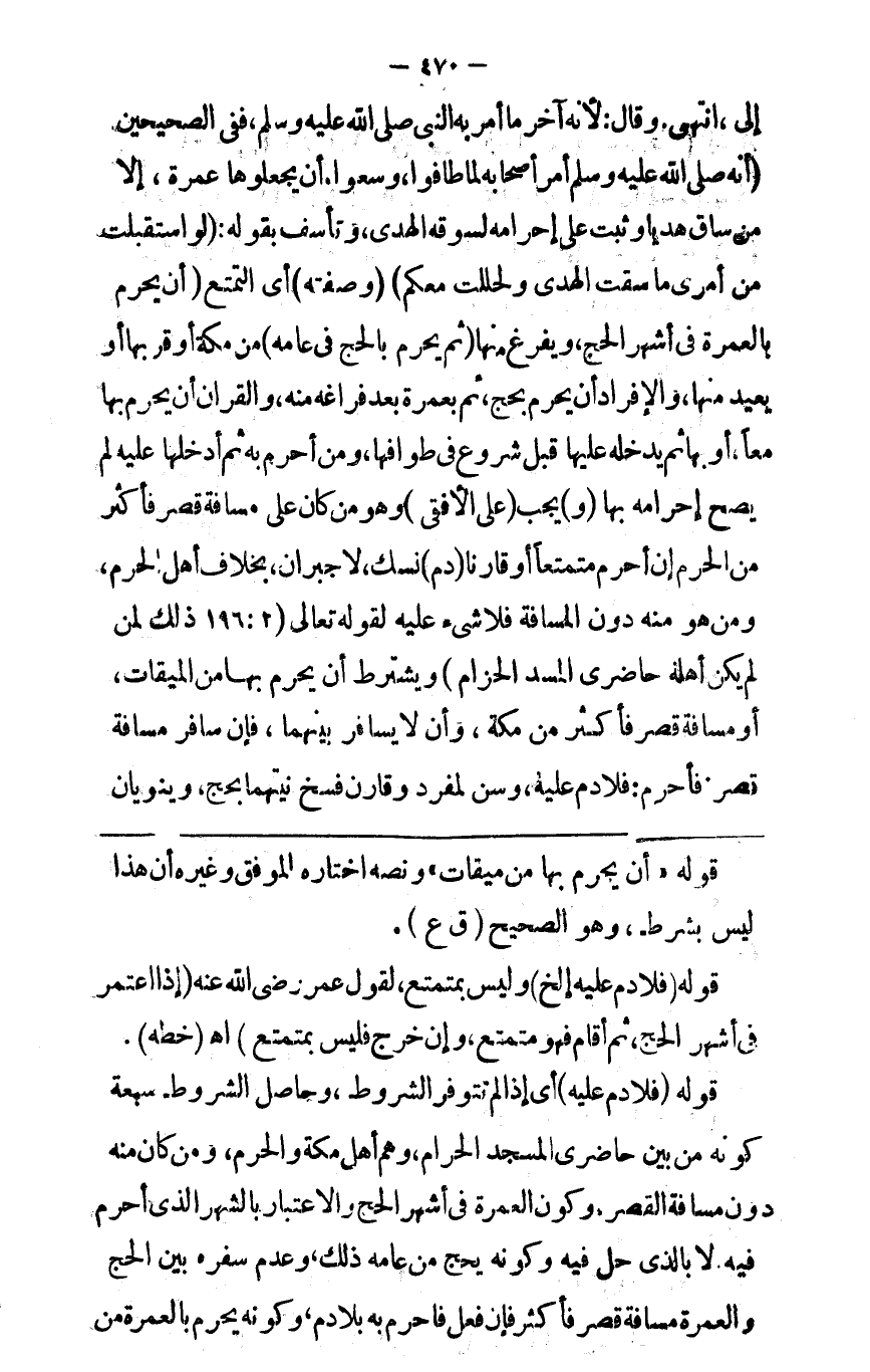 إلي اه وقال لأنه آخر ما أمر به النبي صلى الله وعليه وآله وسلم ففي الصحيحين أنه صلى الله وعليه وآله وسلم أمر أصحابه لما طافوا وسعوا أن يجعلوها عمرة إلا من ساق هديا وثبت على إحرامه لسوقه الهدي وتأسف بقوله لو استقبلت من أمري ما استدبرت ماسقت الهدي ولأحللت معكم ( وصفته ) أي التمتع ( أن يحرم بالعمرة في أشهر الحج ويفرغ منها ثم يحرم بالحج في عامه ) من مكة أو قربها أوبعيد منها والإفراد أن يحرم بحج ثم بعمرة بعد فراغه منه والقران أن يحرم بهما معا أو بها ثم يدخله عليها قبل شروعه في طوافها ومن أحرم به ثم أدخلها عليه لم يصح إحرامه بها ( و ) يجب ( على الأفقي ) وهو من كان مسافة قصر فأكثر من الحرم إن أحرم متمتعا أو قارنا ( دم ) نسك لاجبران بخلاف أهل الحرم ومن هو منه دون المسافة فلا شيء عليه لقوله تعالى { ذلك لمن لم يكن أهله حاضري المسجد الحرام } ويشترط أن يحرم بهما من ميقات أو مسافة قصر فأكثر من مكة وأن لا يسافر بينهما فإن سافر مسافة قصر فأحرم فلا دم عليه وسن لمفرد وقارن فسخ نيتهما بحج وينويان