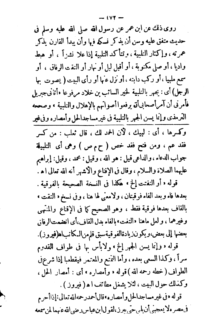 ذلك عن ابن عمر عن رسول الله صلى الله عليه وسلم في حديث متفق عليه وسن أن يذكر نسكه فيها وأن يبدأ القارن بذكر عمرته وإكثار التلبية وتتأكد إذا علا نشزا أو هبط واديا أو صلى مكتوبة أو أقبل ليل أو نهار أو التقت الرفاق أو سمع ملبيا أو فعل محظورا ناسيا أو ركب دابته أو نزل عنها أو رأى البيت ( يصوت بها الرجل ) أي يجهر بالتلبية لخبر السائب بن خلاد مرفوعا أتاني جبريل فأمرني أن آمر أصحابي أن يرفعوا أصواتهم بالإهلال والتلبية وصححه الترمذي وإنما يسن الجهر بالتلبية في غير مساجد الحل وأمصاره وفي غير