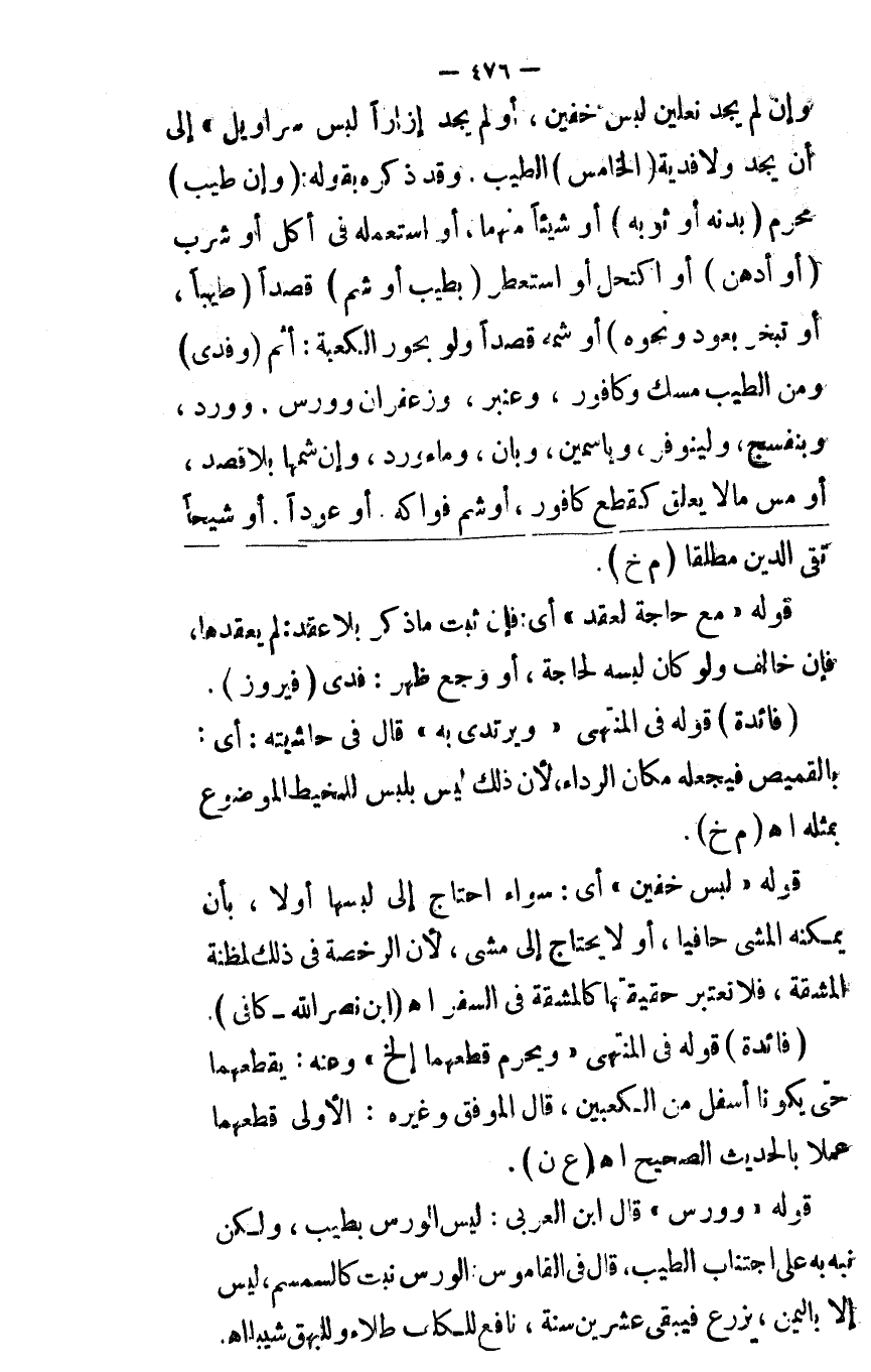 وإن لم يجد نعلين لبس خفين أو لم يجد إزارا لبس سراويل إلى أن يجد ولا فدية الخامس الطيب وقد ذكره بقوله ( وإن طيب ) محرم ( بدنه أو ثوبه ) أو شيئا منهما أو استعمله في أكل أو شرب ( أو ادهن ) أو اكتحل أو استعط ( بطيب أو شم ) قصدا ( طيبا أو تبخر بعود ونحوه ) أو شمه قصدا ولو بخور الكعبة أثم و ( فدى ) ومن الطيب مسك وكافور وعنبر وزعفران وورس وورد وبنفسج ونيلوفر وياسمين وبان وماء ورد وإن شمها بلا قصد أو مس ما لا يعلق كقطع كافور أو شم فواكه أو عودا أو شيحا