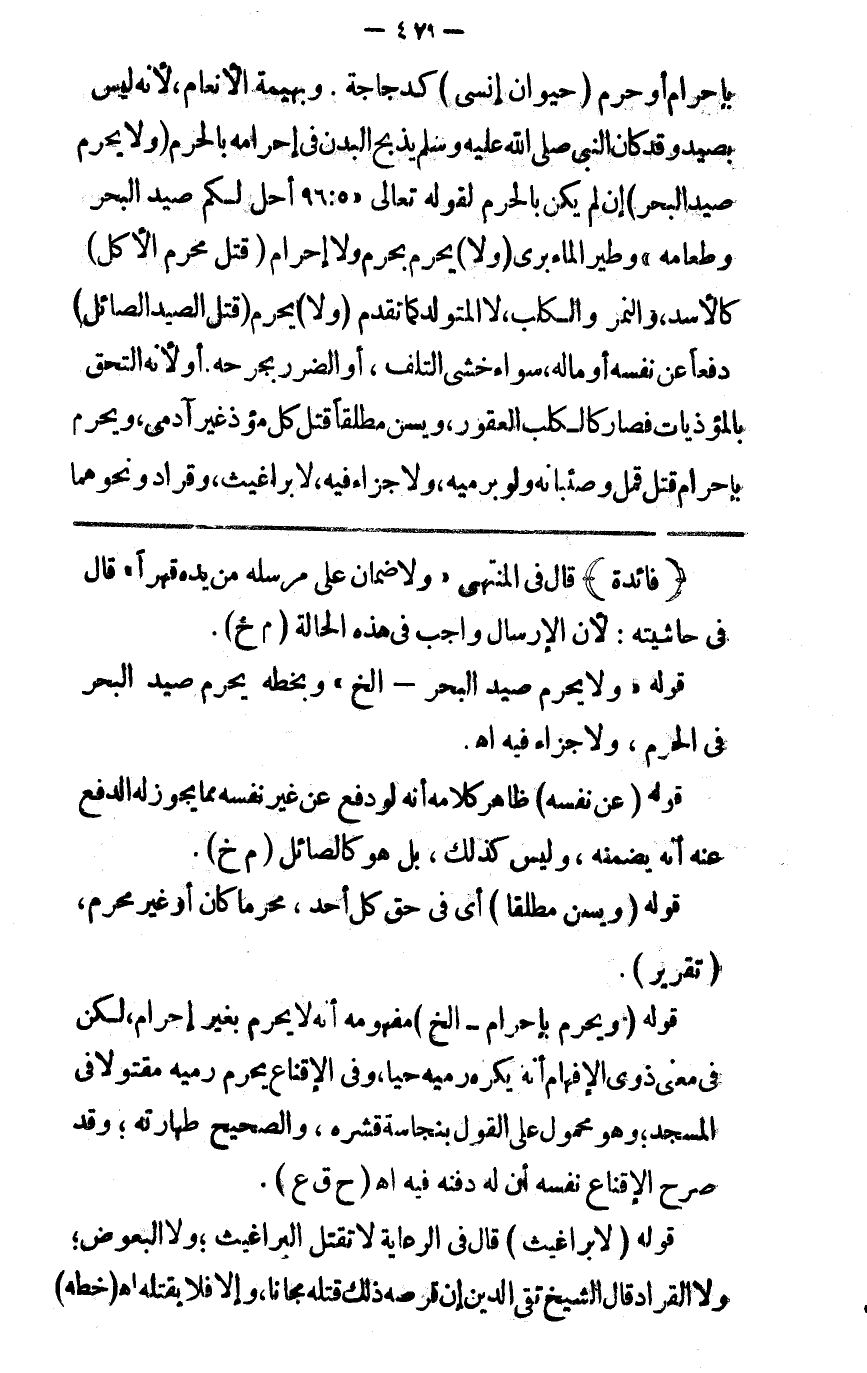 ) بإحرام أو حرم ( حيوان إنسي ) كالدجاج وبهيمة الأنعام لأنه ليس بصيد وقد كان النبي صلى الله عليه وسلم يذبح البدن في إحرامه بالحرم ( ولا ) يحرم ( صيد البحر ) إن لم يكن بالحرم لقوله تعالى { أحل لكم صيد البحر وطعامه } وطير الماء بري ( ولا ) يحرم بحرم ولا إحرام ( قتل محرم الأكل ) كالأسد والنمر والكلب إلا المتولد كما تقدم ( ولا ) يحرم قتل الصيد ( الصائل ) دفعا عن نفسه أو ماله سواء خشي التلف أو الضرر بجرحه أو لا لأنه التحق بالمؤذيات فصار كالكلب العقور ويسن مطلقا قتل كل مؤذ غير آدمي ويحرم بإحرام قتل قمل وصئبانه ولو برميه ولا جزاء فيه لا براغيث وقراد ونحوهما