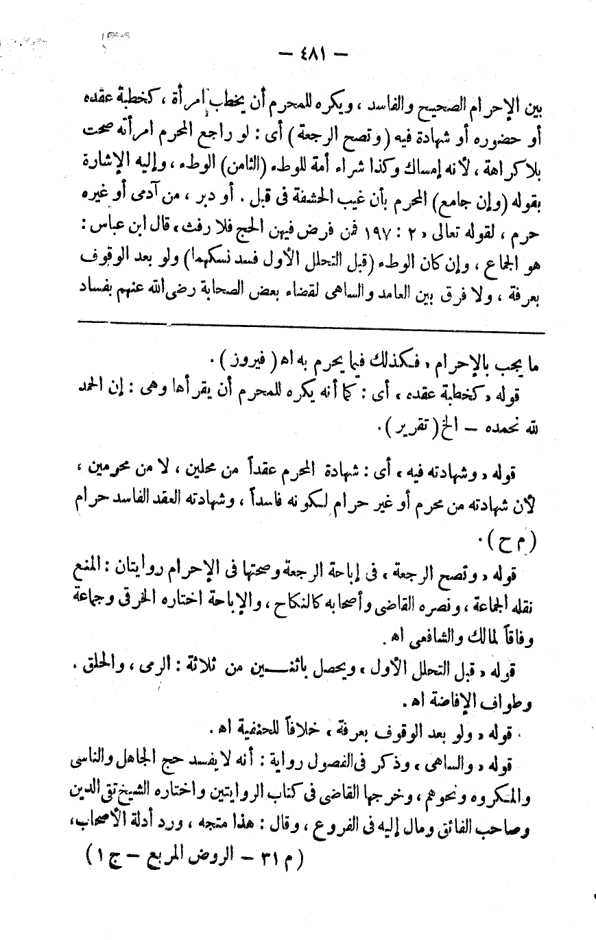 بين الإحرام الصحيح والفاسد ويكره للمحرم أن يخطب امرأة كخطبة عقده أو حضوره أو شهادته فيه ( وتصح الرجعة ) أي لو راجع المحرم امرأته صحت بلا كراهية لأنه إمساك وكذا شراء أمة للوطء الثامن الوطء وإليه الإشارة بقوله ( وإن جامع المحرم ) بأن غيب الحشفة في قبل أو دبر من آدمي أو غيره حرم لقوله تعالى { فمن فرض فيهن الحج فلا رفث } قال ابن عباس هو الجماع وإن كان الوطء ( قبل التحلل الأول فسد نسكهما ) ولو رضي الله عنهم بفساد الحج ولم يستفصل ( ويمضيان فيه ) أي يجب على الواطئ والموطوءة المضي في النسك الفاسد ولا يخرجان منه بالوطء روي عن عمر وعلي وأبي هريرة وابن عباس فحكمه كالإحرام الصحيح لقوله تعالى { وأتموا الحج والعمرة } بعد الوقوف بعرفة ولا فرق بين العامد والساهي لقضاء بعض