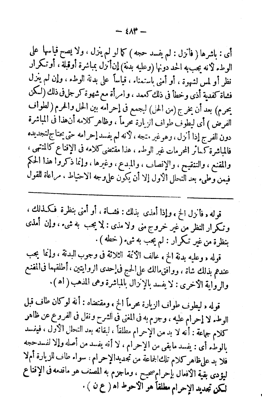 أي باشرها ( فأنزل لم يفسد حجه ) كما لو لم ينزل ولا يصح قياسها على الوطء لأنه يجب به الحد دونها ( وعليه بدنة ) إن أنزل بمباشرة أو قبلة أو تكرار نظر أو لمس لشهوة أو أمنى باستمناء قياسا على الوطء وإن لم ينزل فشاة كفدية أذى وخطأ في ذلك كعمد وامرأة مع شهوة كرجل في ذلك ( لكن يحرم ) بعد أن يخرج ( من الحل ) فيجمع في إحرامه بين الحل والحرم ( لطواف الفرض ) أي ليطوف طواف الزيارة محرما وظاهر كلامه أن هذا في المباشرة دون الفرج إذا أنزل وهو غير متجه لأنه لم يفسد إحرامه حتى يحتاج لتجديده فالمباشرة كسائر المحرمات غير الوطء هذا مقتضى كلامه في الإقناع ك المنتهى و المقنع و التنقيح و الإنصاف و المبدع وغيرها وإنما ذكروا هذا الحكم فيمن وطىء بعد