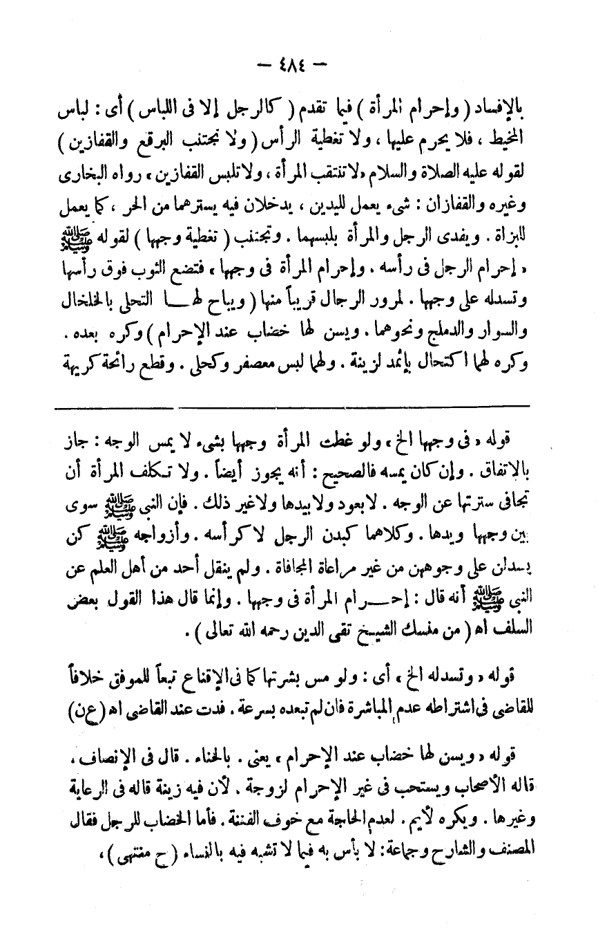 التحلل الأول إلا أن يكون على وجه الاحتياط مراعاة للقول بالإفساد ( وإحرام المرأة ) فيما تقدم ( كالرجل إلا في اللباس ) أي لباس المخيط فلا يحرم عليها ولا تغطية الرأس ( وتجتنب البرقع والقفازين ) لقوله صلى الله عليه وسلم لا تنتقب المرأة ولا تلبس القفازين رواه البخاري وغيره والقفازان شيء يعمل لليدين يدخلان فيه يسترهما من الحر كما يعمل للبزاة ويفدي الرجل والمرأة بلبسهما ( و ) تجتنب ( تغطية وجهها ) لقوله صلى الله عليه وسلم إحرام الرجل في رأسه وإحرام المرأة في وجهها فتضع الثوب فوق رأسها وتسدله على وجهها لمرور الرجال قريبا منها ( ويباح لها التحلي ) بالخلخال والسوار والدمالج ونحوها ويسن لها خضاب عند إحرام وكره بعده وكره لهما اكتحال بإثمد لزينة