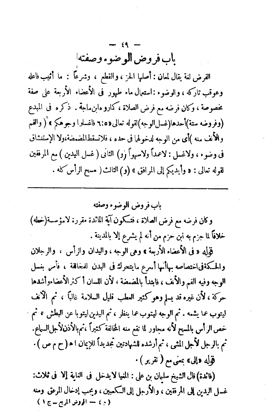 1 - الفرض لغة يقال لمعان أصلها الحز والقطع وشرعا ماأثيب فاعله وعوقب تاركه والوضوء استعمال ماء طهور في الأعضاء الأربعة على صفة مخصوصة وكان فرضه مع فرض الصلاة كما رواه ابن ماجه ذكره في المبدع (فروضه ستة) أحدها (غسل الوجه) لقوله تعالى {فاغسلوا وجوهكم} والفم والأنف منه أي من الوجه لدخولهما في حده فلا تسقط المضمضة ولا الاستنشاق في وضوء ولاغسل لاعمدا ولاسهوا (و) الثاني (غسل اليدين) مع المرافقين لقوله تعالى {وأيديكم إلى المرافق} و الثالث (مسح الرأس) كله (ومنه الأذنان) لقوله تعالى {وامسحوا برؤوسكم >