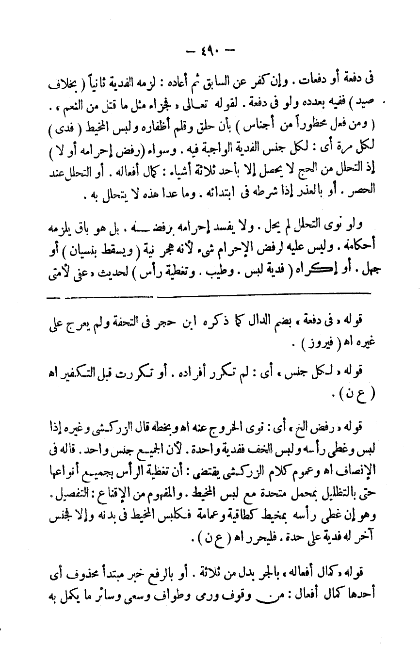 لأن الله تعالى أوجب في حلق الرأس فدية واحدة ولم يفرق بين ما وقع في دفعة أو دفعات وإن كفر عن السابق ثم أعاده لزمته الفدية ثانيا ( بخلاف صيد ) ففيه بعدده ولو في دفعة لقوله تعالى { فجزاء مثل ما قتل من النعم } ومن فعل محظورا من أجناس بأن حلق وقلم أظافره ولبس المخيط ( فدى لكل مرة ) أي لكل جنس فديته الواجبة فيه سواء ( رفض إحرامه أو لا ) إذ التحلل من الحج لايحصل إلا بأحد ثلاثة أشياء كمال أفعاله أو التحلل عند الحصر أو بالعذر إذا شرطه في ابتدائه وما عدا هذه لايتحلل به ولو نوى التحلل لم يحل ولا يفسد إحرامه برفضه بل هو باق تلزمه أحكامه وليس عليه لرفض الإحرام شيء لأنه مجرد نية كيفية التصرف في الفدية ( ويسقط بنسيان ) أو جهل أو إكراه ( فدية لبس وطيب وتغطية رأس ) لحديث عفي لأمتي عن