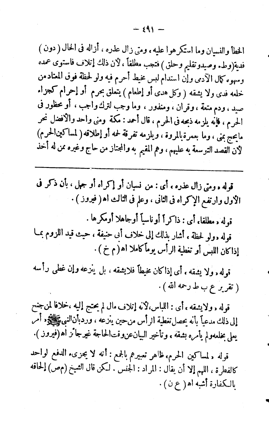 الخطأ والنسيان وما استكرهوا عليه ومتى زال عذره أزاله في الحال ( دون ) فدية ( وطء وصيد وتقليم وحلاق ) فتجب مطلقا لأن ذلك إتلاف فاستوى عمده وسهوه كمال الآدمي فإن استدام لبس مخيط أحرم فيه ولو لحظة فوق المعتاد من خلعه فدى ولا يشقه ( وكل هدي أو إطعام ) يتعلق بحرم أو إحرام كجزاء صيد ودم متعة وقران ومنذور وما وجب لترك واجب أو فعل محظور في الحرم فإنه يلزمه ذبحه في الحرم قال أحمد مكة ومنى واحد والأفضل نحر مابحج بمنى وما بعمرة بالمروة ويلزمه تفرقة لحمه أو إطلاقه ( لمساكين الحرم ) لأن القصد التوسعة عليهم وهو المقيم به والمجتاز من حاج وغيره ممن له أخذ