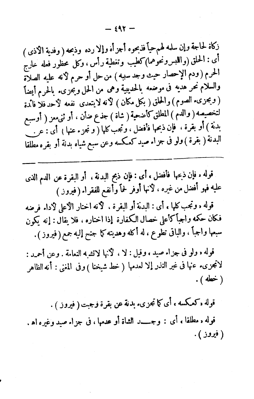زكاة لحاجة وإن سلمه لهم حيا فذبحوه أجزأ وإلا رده وذبحه ( وفدية الأذى ) أي الحلق ( واللبس ونحوهما ) كطيب وتغطية رأس وكل محظور فعله خارج الحرم ( ودم الإحصار حيث وجد بسببه ) من حل أو حرم لأنه صلى الله عليه وسلم نحر هديه في موضعه بالحديبية وهي من الحل ويجزئ بالحرم أيضا ( ويجزئ الصوم ) والحلق ( بكل مكان ) لأنه لايتعدى نفعه لأحد فلا فائدة لتخصيصه ( والدم ) المطلق شاة كأضحية ( شاة ) جذع أو ثني معز ( أو سبع بدنة ) أو بقرة فإن ذبحها فأفضل وتجب كلها ( وتجزئ عنها ) أي عن البدنة ( بقرة ) ولو في جزاء صيد كعكسه وعن سبع شياه بدنة واحدة أو بقرة مطلقا