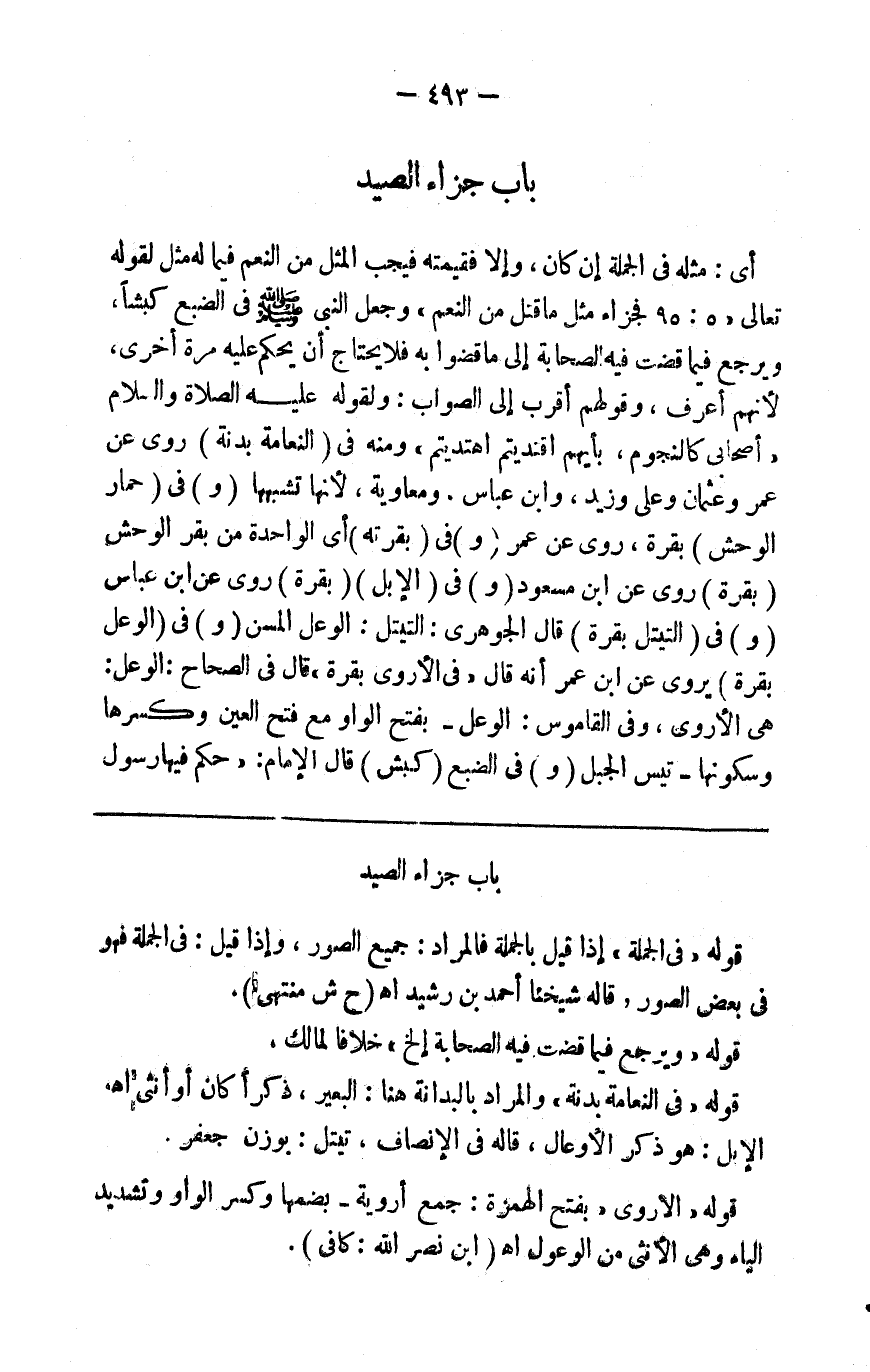 1 - أي مثله في الجملة إن كان وإلا فقيمته فيجب المثل من النعم فيما له مثل لقوله تعالى {فجزاء مثل ما قتل من النعم} وجعل النبي صلى الله عليه وسلم في الضبع كبشا ويرجع فيما قضت به الصحابة إلى ما قضوا به فلا يحتاج أن يحكم عليه مرة أخرى لأنهم أعرف وقولهم أقرب إلى الصواب ولقوله صلى الله عليه وسلم أصحابي كالنجوم بأيهم اقتديتم اهتديتم ومنه (في النعامة بدنة) روي عن عمر وعثمان وعلي وزيد وابن عباس ومعاوية لأنها تشبهها (و) في (حمار الوحش) بقرة روي عن عمر (و) في (بقرته) أي الواحدة من بقر الوحش بقرة روي عن ابن مسعود (و) في (الإبل) على وزن قنب وخلب وسيد بقرة روي عن ابن عباس (و) في (التيتل) بقرة قال الجوهري التيتل الوعل المسن (و) في (الوعل بقرة) يروى عن عمر أنه قال في الأروي بقرة قال في الصحاح الوعل هي الأروي وفي القاموس الوعل بفتح الواو مع فتح العين وكسرها وسكونها تيس الجبل (و) في (الضبع كبش)