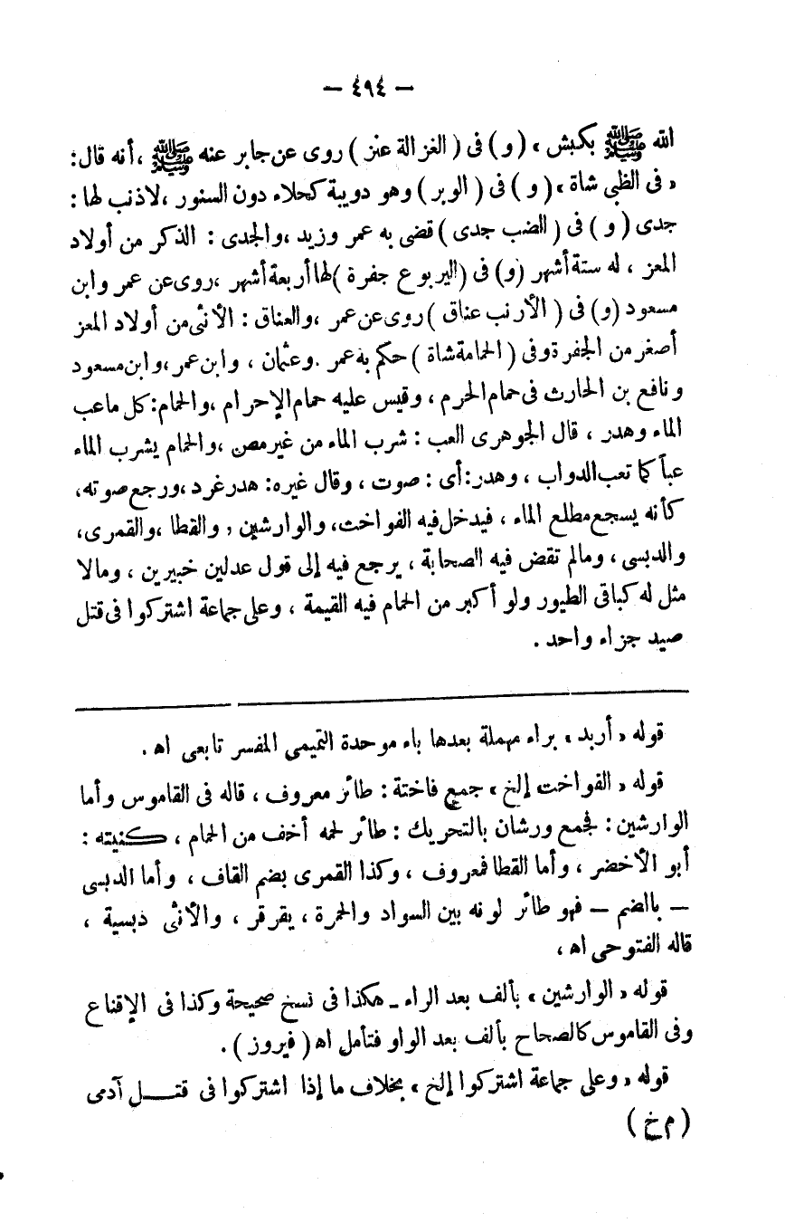 قال الإمام حكم فيها رسول الله صلى الله عليه وسلم بكبش ( و ) في ( الغزالة عنز ) روي عن جابر عنه صلى الله عليه وسلم أنه قال في الظبي شاة ( و ) في ( الوبر ) وهو دويبة كحلاء دون السنور لا ذنب لها جدي ( و ) في ( الضب جدي ) قضى به عمر وزيد والجدي الذكر من أولاد المعز له ستة أشهر ( و ) في ( اليربوع جفرة ) لها أربعة أشهر روي عن عمر وابن مسعود ( و ) في ( الأ رنب عناق ) روي عن عمر والعناق الأنثى من أولاد المعز أصغر من الجفرة ( و ) في ( الحمامة شاة ) حكم به عمر وعثمان وابن عمر وابن عباس ونافع بن عبد عبد الحارث في حمام الحرم وقيس عليه حمام الإحرام والحمام كل ما عب الماء وهدر قال الجوهري العب شرب الماء من غير مص والحمام يشرب الماء عبا كما تعب الدواب وهدر أي صوت وقال غيره هدر غرد ورجع صوته كأنه يسجع مطلع الماء فيدخل فيه الفواخت والوراشين والقطا والقمري والدبسي وما لم تقض فيه الصحابة يرجع فيه إلى قول عدلين خبيرين وما لا مثل له كباقي الطيور ولو أكبر من الحمام فيه القيمة وعلى جماعة اشتركوا في قتل صيد جزاء واحد