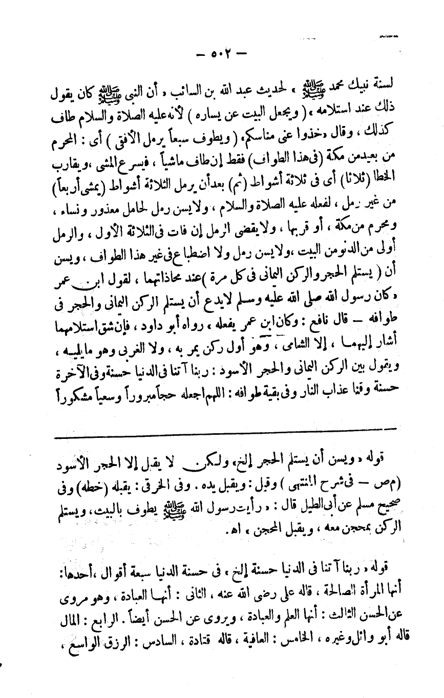 لسنة نبيك محمد صلى الله عليه وسلم لحديث عبد الله بن السائب أن النبي صلى الله عليه وسلم كان يقول ذلك عند استلامه ( ويجعل البيت عن يساره ) لأنه صلى الله عليه وسلم طاف كذلك وقال خذوا عني مناسككم ( ويطوف سبعا يرمل الأفقي ) أي المحرم من بعيد من مكة ( في هذا الطواف ) فقط إن طاف ماشيا فيسرع المشي ويقارب الخطا ( ثلاثا ) أي في ثلاثة أشواط ( ثم ) بعد أن يرمل الثلاثة الأشواط ( يمشي أربعا ) من غير رمل لفعله صلى الله عليه وسلم ولا يسن رمل لحامل معذور ونساء ومحرم من مكة أو قربها ولا يقضي الرمل إن فات في الثلاثة الأول والرمل أولى من الدنو من البيت ولا يسن رمل ولا اضطباع في غير هذا الطواف ( و ) يسن أن ( يستلم الحجر والركن اليماني كل مرة ) عند محاذاتهما لقول ابن عمر كان رسول الله صلى الله عليه وسلم لا يدع أن يستلم الركن اليماني والحجر في طوافه قال نافع وكان ابن عمر يفعله رواه أبو داود فإن شق استلامهما أشار إليهما لا الشامي وهو أول ركن يمر به ولا الغربي وهو ما يليه ويقول بين الركن اليماني والحجر الأسود ربنا آتنا في الدنيا حسنة