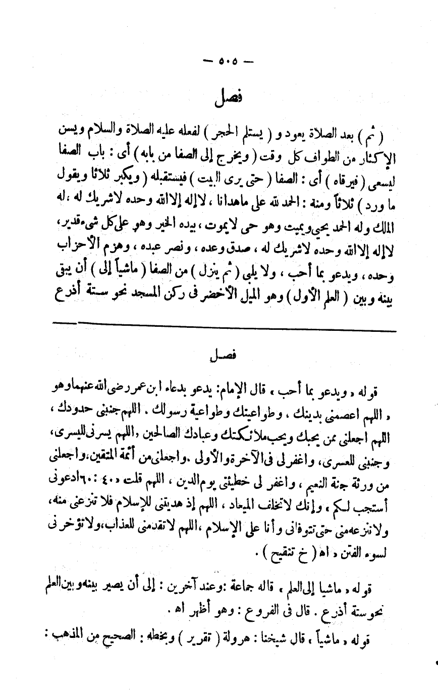 1 - (ثم) بعد الصلاة يعود و (يستلم الحجر) لفعله صلى الله عليه وسلم ويسن الإكثار من الطواف كل وقت (ويخرج إلى الصفا من بابه) أي باب تالصفا ليسعى (فيرقاه) أي الصفا (حتى يرى البيت) فيستقبله (ويكبر ثلاثا ويقول ما ورد) ثلاثا ومنه الحمد لله على ما هدانا لا إله إلا الله وحده لا شريك له له الملك وله الحمد يحيي ويميت وهو حي لا يموت بيده الخير وهو على كل شيء قدير لا إله إلا الله وحده لا شريك له صدق وعده ونصر عبده وهزم الأحزاب وحده ويدعو بما أحب ولا يلبي (ثم ينزل) من الصفا (ماشيا إلى) أن يبقى بينه وبين (العلم الأول) وهو الميل الأخضر في ركن المسج