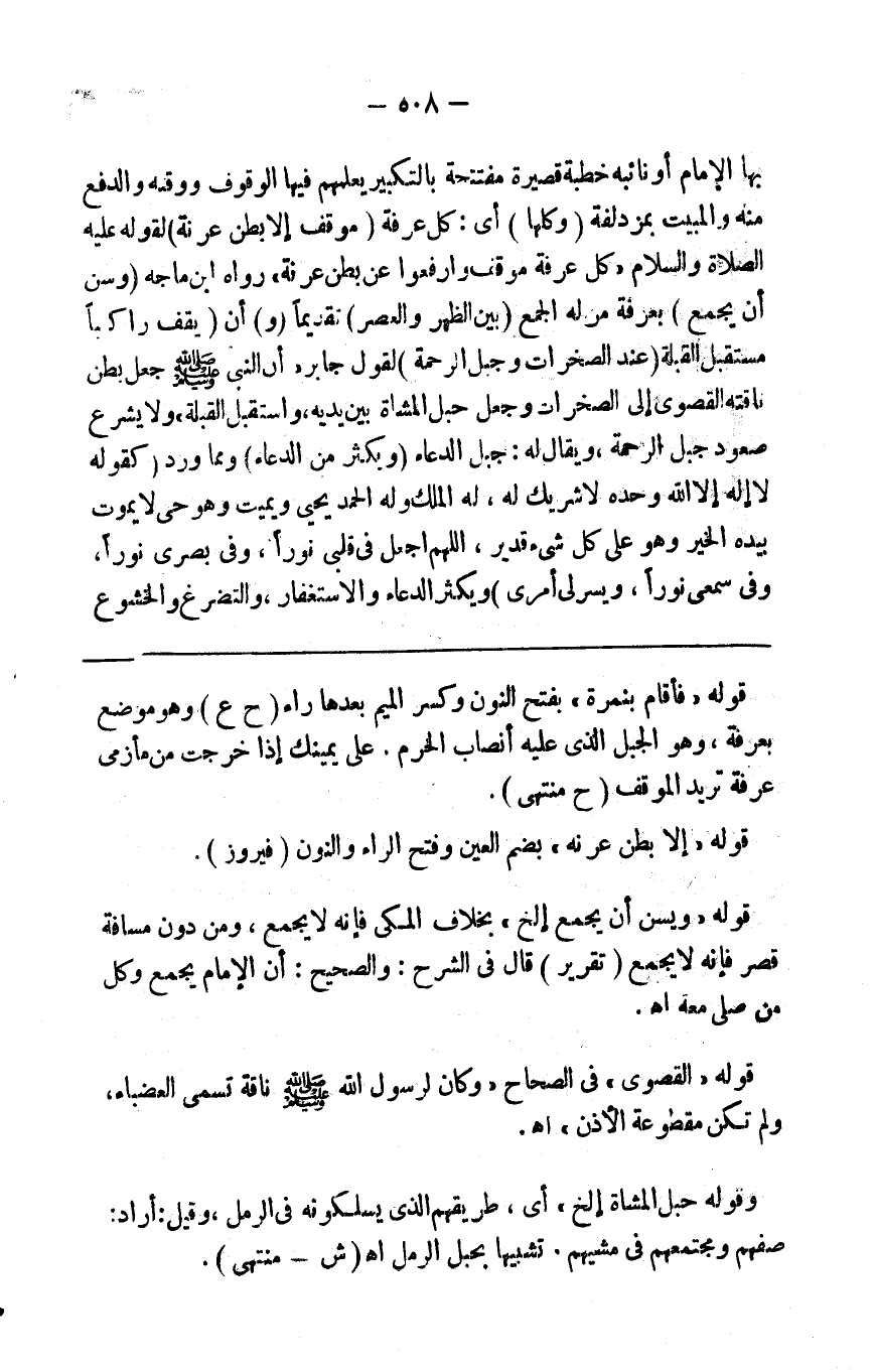 فأقام بنمرة إلى الزوال يخطب بها الإمام أو نائبه خطبة قصيرة مفتتحة بالتكبير يعلمهم فيها الوقوف ووقته والدفع منه والمبيت بمزدلفة ( وكلها ) أي كل عرفة ( موقف إلا بطن عرنة ) لقوله صلى الله عليه وسلم كل عرفة موقف وارفعوا عن بطن عرنة رواه ابن ماجه ( وسن أن يجمع ) بعرفة من له الجمع ( بين الظهر والعصر ) تقديما ( و ) ان ( يقف راكبا ) مستقبل القبلة ( عند الصخرات وجبل الرحمة ) لقول جابر إن النبي صلى الله عليه وسلم جعل بطن ناقته القصوى إلى الصخرات وجعل جبل المشاة بين يديه واستقبل القبلة ولا يشرع صعود جبل الرحمة ويقال له جبل الدعاء ( ويكثر في الدعاء بما ورد ) كقوله لا إله إلا الله وحده لا شريك له له الملك وله الحمد يحيي ويميت وهو حي لا يموت بيده الخير وهو على كل شيء قدير اللهم اجعل في قلبي نورا وفي بصري نورا وفي سمعي