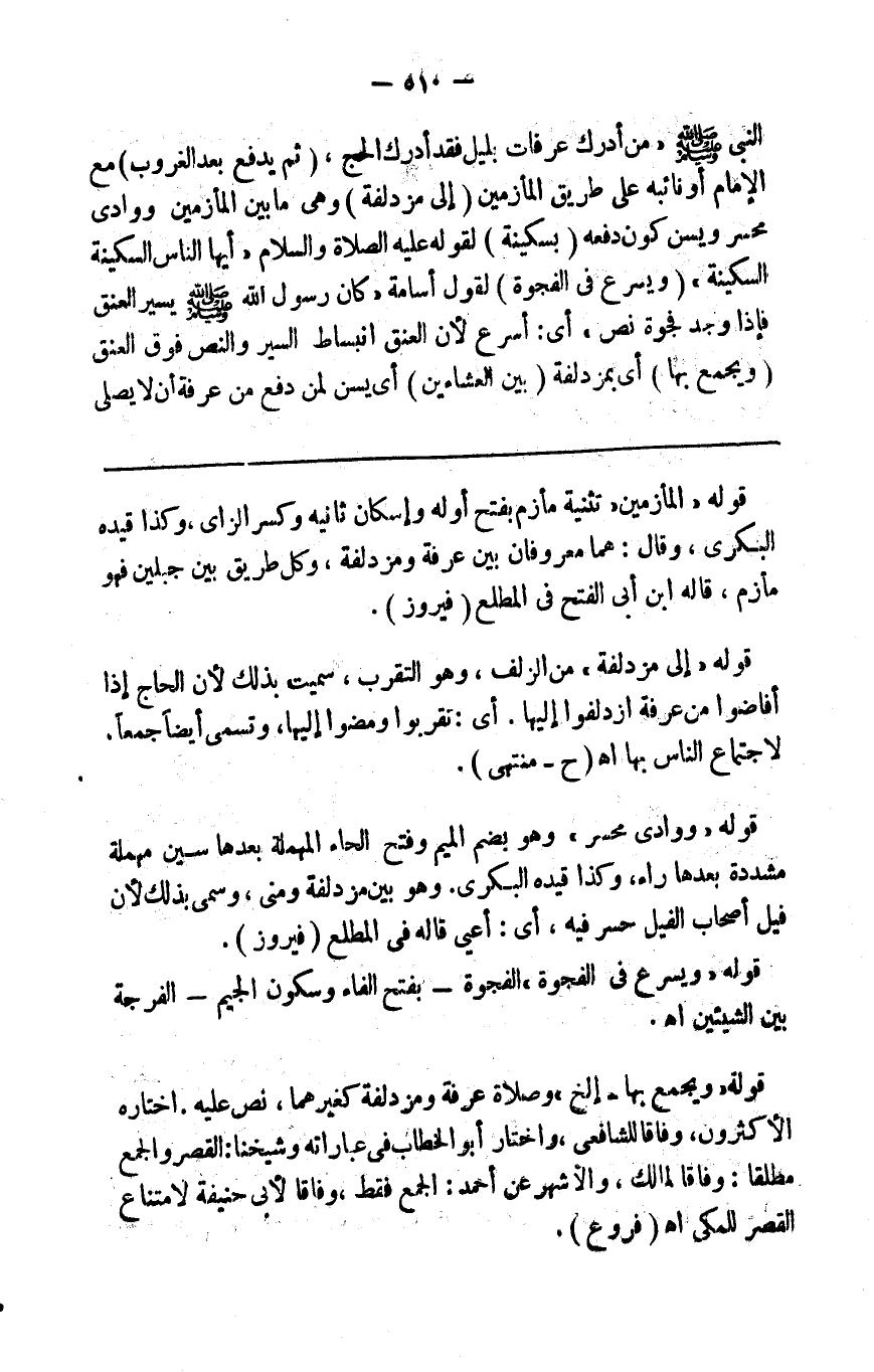 دم عليه قال في شرح المقنع لا نعلم فيه خلافا لقول النبي صلى الله عليه وسلم من أدرك عرفات بليل فقد أدرك الحج ) ثم يدفع بعد الغروب مع الإمام أو نائبة على طريق المأزمين ( إلى مزدلفة ) وهي ما بين المأزمين إلى وادي محسر ويسن كون دفعه ( بسكينة ) لقوله صلى الله عليه وسلم أيها الناس السكينة السكينة ( ويسرع في الفجوة ) لقول أسامة كان رسول الله صلى الله عليه وسلم يسير العنق فإذا وجد فجوة نص أي أسرع لأن العنق انبساط السير والنص فوق العنق ( ويجمع ) أي بمزدلفة ( بين العشاءين ) أي يسن لمن دفع من عرفة أن لا يصلي المغرب حتى