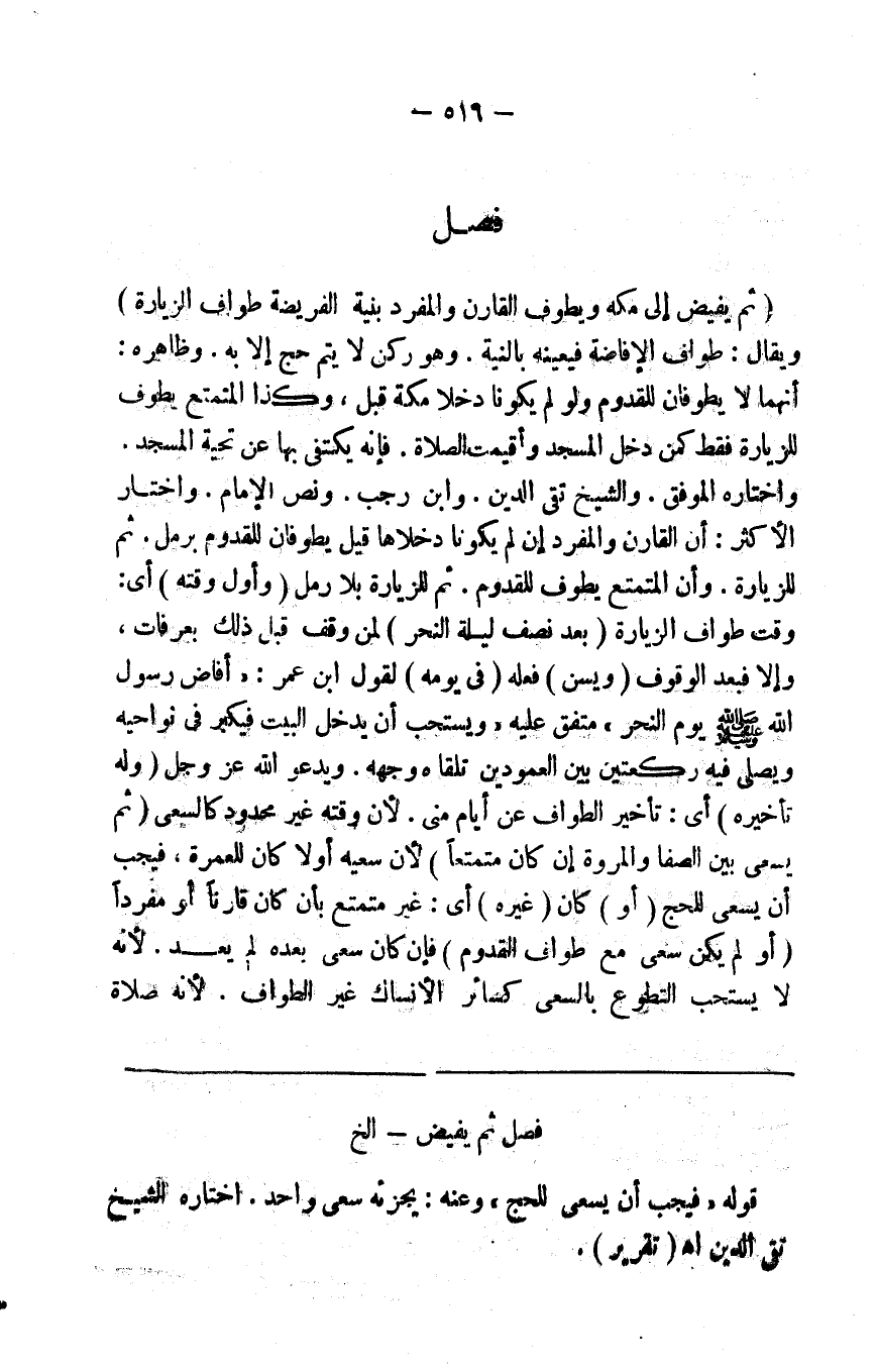1 - (ثم يفيض إلى مكة ويطوف القارن والمفرد بنية الفريضة طواف الزيارة) ويقال طواف الإفاضة فيعينه بالنية وهو ركن لا يتم حج إلا به وظاهرة أنهما لا يطوفان للقدوم ولو لم يكونا دخلا مكة قبل وكذا المتمتع يطوف للزيارة فقط كمن دخل المسجد وأقيمت الصلاة فإنه يكتفي بها عن تحية المسجد واختاره الموفق والشيخ تقي الدين وابن رجب ونص الإمام واختاره الأكثر أن القارن والمفرد إن لم يكونا دخلاها قبل يطوفان للقدوم برمل ثم للزيارة وأن المتمتع يطوف للقدوم ثم للزيارة بلا رمل (وأول وقته) أي وقت طواف الزيارة (بعد نصف ليلة النحر) لمن وقف قبل ذلك بعرفات وإلا بعد الوقوف (ويسن) فعله (في يومه) لقول ابن عمر أفاض رسول الله صلى الله عليه وسلم يوم النحر متفق عليه ويستحب أن يدخل البيت فيكبر في نواحيه ويصلي فيه ركعتين بين العمودين تلقاء وجهه ويدعو الله عز وجل (وله تأخيره) أي تأخير الطواف عن أيام منى لأن آخر وقته غير محدود كالسعي (ثم يسعى بين الصفا والمروة إن كان متمتعا) لأن سعيه أولا كان للعمرة فيجب أن يسعى للحج (أو) كان (غيره) أي غير متمتع بأن كان قارنا أو مفردا (ولم يكن سعى مع طواف القدوم) فإن كان سعى بعده لم يعده لأنه لا يستحب التطوع بالسعي كسائر الأنساك غي