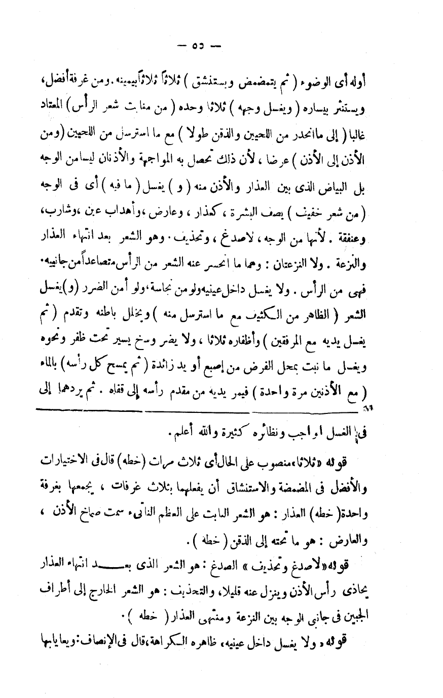 أوله أي الوضوء ( ثم يتمضمض ويستنشق ) ثلاثا ثلاثا بيمينه ومن غرفة أفضل ويستنثر بيساره ويغسل وجهه ثلاثا وحده ( من منابت شعر الرأس ) المعتاد غالبا ( إلى ما انحدر من اللحيين والذقن طولا ) مع ما استرسل من اللحية ( ومن الأذن إلى الأذن عرضا ) لأن ذلك تحصل به المواجهة 0 والأذنان ليسا من الوجه بل البياض الذي بين العذار والأذن منه ( و ) يغسل ( ما فيه ) أي في الوجه ( من شعر خفيف ) يصف البشرة كعذار وعارض وأهداب عين وشارب وعنفقة لأنها من الوجه لا صدغ وتحذيف وهو الشعر بعد انتهاء العذار والنزعة ولا النزعتان وهما ما انحسر عنه الشعر من الرأس متصاعدا من جانبيه فهما من الرأس ولايغسل من داخل عينيه ولو من نجاسة ولو أمن الضرر ( و ) يغسل الشعر ( الظاهر ) من ( الكثيف مع ما استرسل منه ) ويخلل باطنه وتقدم ( ثم ) يغسل ( يديه مع المرفقين ) وأظفاره ثلاثا ولا يضر وسخ يسير تحت ظفر ونحوه ويغسل ما نبت بمحل الغرض من إصبع أو يد زائدة ( ثم يمسح كل رأسه ) بالماء ( مع الأذنين مرة واحدة فيمر يديه من مقدم رأسه إلى قفاه ثم يردهما إلى