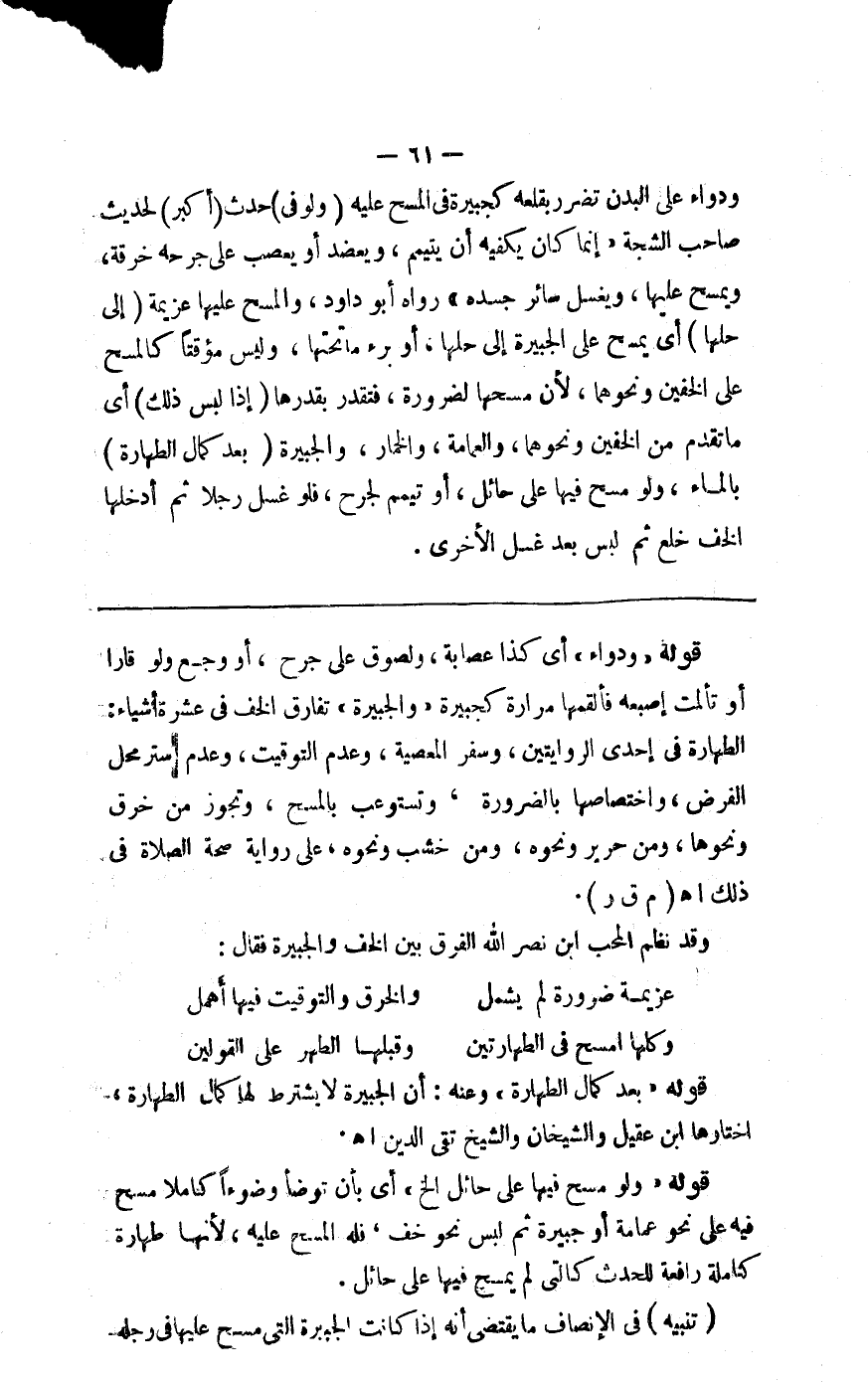 ودواء على البدن تضرر بقلعه كجبيرة في المسح عليه ( ولو في ) حدث ( أكبر ) لحديث صاحب الشجة إنما كان يكفيه أن يتيمم ويعضد أو يعصب على جرحه خرقة ويمسح عليها ويغسل سائر جسده رواه أبو داود والمسح عليها عزيمة ( إلى حلها ) أي يمسح على الجبيرة إلى حلها أو برء ما تحتها وليس موقتا كالمسح على الخفين ونحوهما لأن مسحها للضرورة فيتقدر بقدرها ( إذا لبس ذلك ) أي ما تقدم من الخفين ونحوهما والعمامة والخمار والجبيرة ( بعد كمال الطهارة ) بالماء ولو مسح فيها على حائل أو تيمم لجرح فلو غسل رجلا ثم أدخلها الخف خلع ثم لبس بعد غسل الآخرى