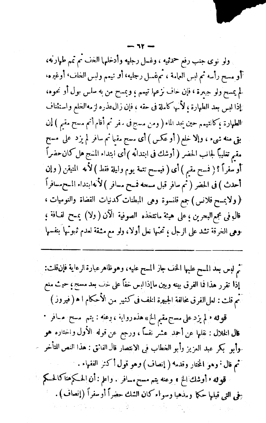 ولو نوى جنب رفع حدثيه وغسل رجليه وأدخلهما الخف ثم تمم طهارته أو مسح رأسه ثم لبس العمامة ثم غسل رجليه أو تيمم ولبس الخف أو غيره لم يمسح ولو جبيرة فإن خاف نزعها تيمم ويمسح من به سلس بول أو نحوة إذا لبس بعد الطهارة لأنها كاملة في حقه فإن زال عذره لزمه الخلع واستئناف الطهارة كالمتيمم يجد الماء ( ومن مسح في سفر ثم أقام ) أتم مسح مقيم إن بقي منه شيء وإلا خلع ( أو عكس ) أي مسح مقيما ثم سافر لم يزد على مسح مقيم تغليبا لجانب الحضر ( أو شك في ابتدائه ) أي ابتداء المسح هل كان حضرا أو سفرا ( فمسح مقيم ) أي فيمسح تتمة يوم وليلة فقط لأنه المتيقن ( وإن أحدث ) في الحضر ( ثم سافر قبل مسحه فمسح مسافر ) لأنه ابتدأ المسح مسافرا ( ولا يمسح قلانس ) جمع قلنسوة وهي المبطنات كدنيات القضاة والكوميات قال في مجمع البحرين على هيئة ما تتخذه الصوفية الآن ( ولا ) يمسح ( لفافة ) وهي الخرقة تشد على الرجل تحتها نعل أو لا ولو مع مشقة لعدم ثبوتها بنفسها